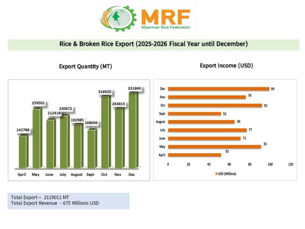 ပြီးခဲ့သည့် ဒီဇင်ဘာလတွင်း ဆန်နှင့်ဆန်ကွဲတန်ချိန် ၃၃၁,၈၆၉ အထိ တင်ပို့နိုင်ခဲ့၍ တစ်လအတွင်း နိုင်ငံခြားဝင်ငွေ ဒေါ်လာ ၉၉ သန်း ရရှိခဲ့ပြီး ယခုဘဏ္ဍာနှစ်အတွင်း လစဉ်တင်ပို့မှုများတွင် တင်ပို့မှုအများဆုံးနှင့် ဝင်ငွေအများဆုံးရရှိခဲ့ခြင်းဖြစ်သည်။