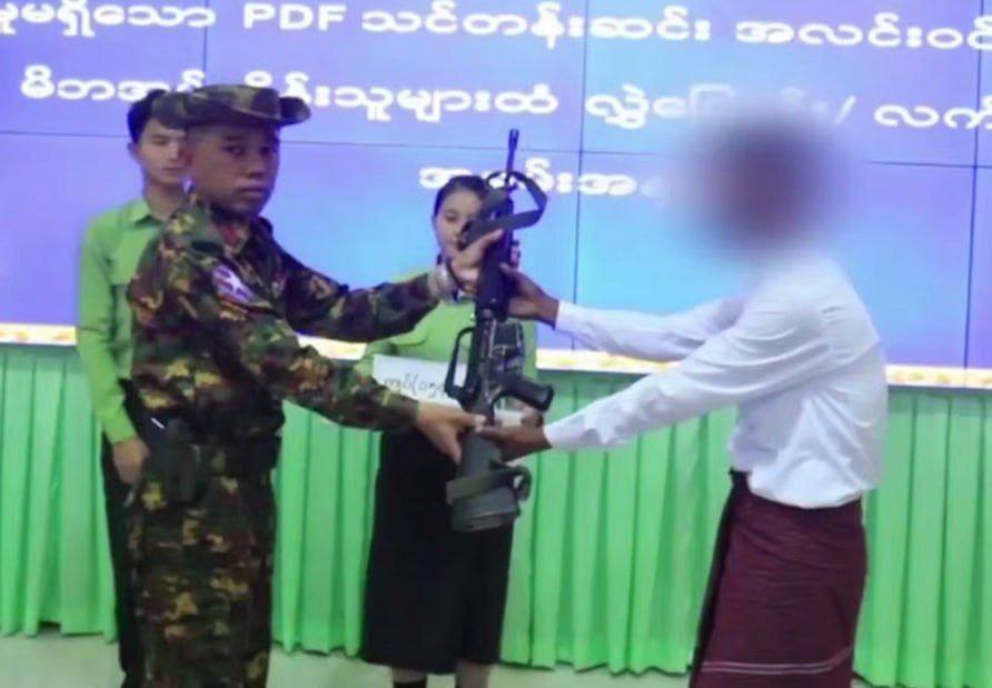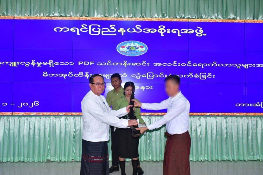 နိုင်ငံတော်အစိုးရသည် PDF အပါအဝင် အဖွဲ့အစည်းအမျိုးမျိုးအမည်ခံ၍ လက်နက်ကိုင်ဆန့်ကျင်လျက်ရှိသည့် အဖွဲ့အစည်းများအတွင်း ရောက်ရှိနေသူများအား ဥပဒေဘောင်အတွင်းသို့ ပြန်လည်ဝင်ရောက်ရန် ဖိတ်ခေါ်၍ ဥပဒေဘောင်အတွင်းသို့ ပြန်လည်ဝင်ရောက်လာကြသူများကိုလည်း လိုအပ်သည့် ကူညီပံ့ပိုးမှုများဆောင်ရွက်ပေးလျက်ရှိရာ နိုင်ငံတော်နှင့် တပ်မတော်၏ ငြိမ်းချမ်းရေးလုပ်ငန်းစဉ်များကို နားလည်သဘောပေါက်လာသည့် PDF အမည်ခံအဖွဲ့ဝင် အမျိုးသား(၅)ဦးတို့သည် လက်နက်၊ ခဲယမ်းများနှင့်အတူ ယနေ့တွင် ဥပဒေဘောင်အတွင်းသို့ ဝင်ရောက်လာကြသည်။