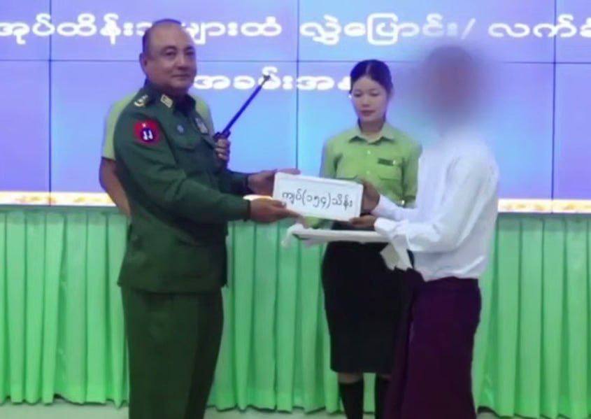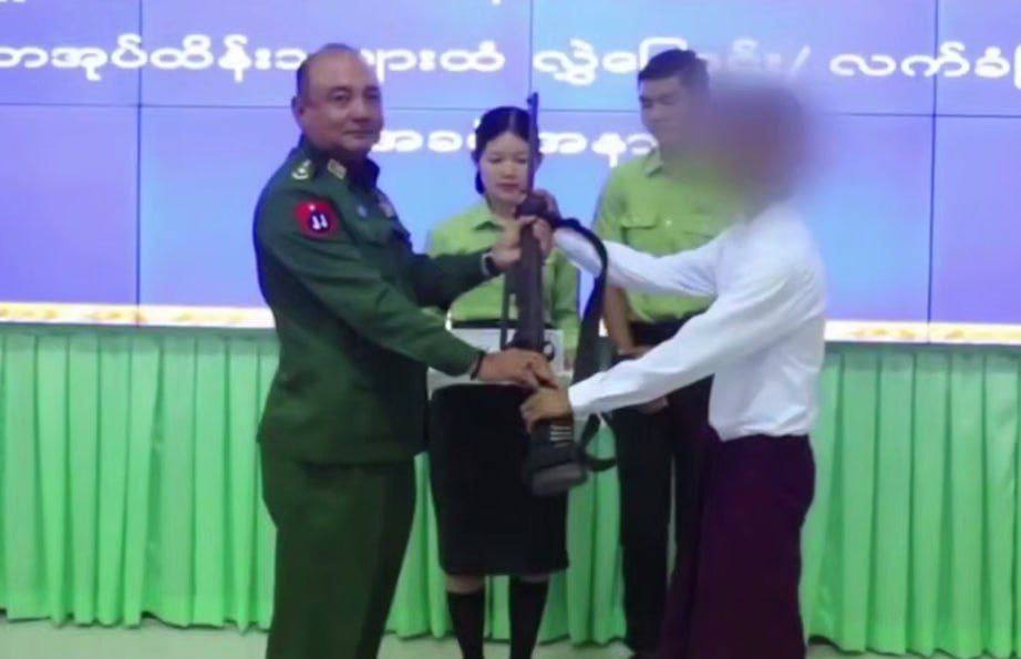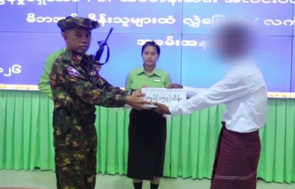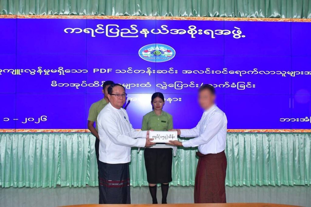 ယင်းနောက် ပြည်နယ်ဝန်ကြီးချုပ်၊ ဒုတိယတိုင်းမှူးနှင့် တာဝန်ရှိသူများက လက်နက်၊ ခဲယမ်းများနှင့်အတူ ဥပဒေဘောင်အတွင်း ဝင်ရောက်လာသူများအား မောင်းပြန်ရိုင်ဖယ် ၁ လက်ကို ဆုကြေးငွေ သိန်း ၅၀ နှုန်းဖြင့် ၂ လက်အတွက် ငွေကျပ် သိန်း ၁၀၀ ၊ ပစ္စတိုသေနတ်တစ်လက်အတွက် ဆုကြေးငွေ ကျပ်သိန်း ၂၀ ၊ လက်လုပ်သေနတ် တစ်လက်ကို ဆုကြေးငွေ ၅ သိန်းနှုန်းဖြင့် သေနတ် ၂ လက်အတွက် ငွေကျပ် ၁၀ သိန်း၊ လက်ပစ်ဗုံးနှင့် လက်လုပ်မိုင်းတစ်လုံးစီကို ဆုကြေးငွေကျပ် ၃ သိန်းနှုန်းဖြင့် လက်ပစ်ဗုံးနှင့် လက်လုပ်မိုင်း ၈ လုံးအတွက် ငွေကျပ် ၂၄ သိန်း စုစုပေါင်းငွေကျပ် ၁၅၄ သိန်းကျပ်နှင့် ထောက်ပံ့ပစ္စည်းများကို ထောက်ပံ့ပေးအပ်ကာ ခံဝန်ကတိလက်မှတ်ရေးထိုးစေပြီး မိဘအုပ်ထိန်းသူများထံ ပြန်လည်လွှဲပြောင်း အပ်နှံပေးအပ်ခဲ့သည်။