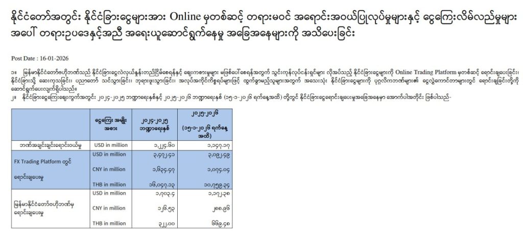 နိုင်ငံခြားငွေကြေးဈေးကွက်အတွင်း ရောင်းချပေးခဲ့သည့်ပမာဏအနက်မှ အရေးကြီးကဏ္ဍများဖြစ်သည့် စက်သုံးဆီ၊ စားသုံးဆီ၊ ဆက်သွယ်ရေး၊ လျှပ်စစ်ကဏ္ဍများသို့ ၂၀၂၄-၂၀၂၅ ဘဏ္ဍာရေးနှစ်တွင် အမေရိကန်ဒေါ်လာ သုံးဘီလျံကျော်နှင့် ၂၀၂၅-၂၀၂၆ ဘဏ္ဍာရေးနှစ် ဇန်နဝါရီ ၁၅ ရက်အထိတွင် အမေရိကန်ဒေါ်လာ သုံးဘီလျံကျော် ရောင်းချပေးခဲ့သည်။