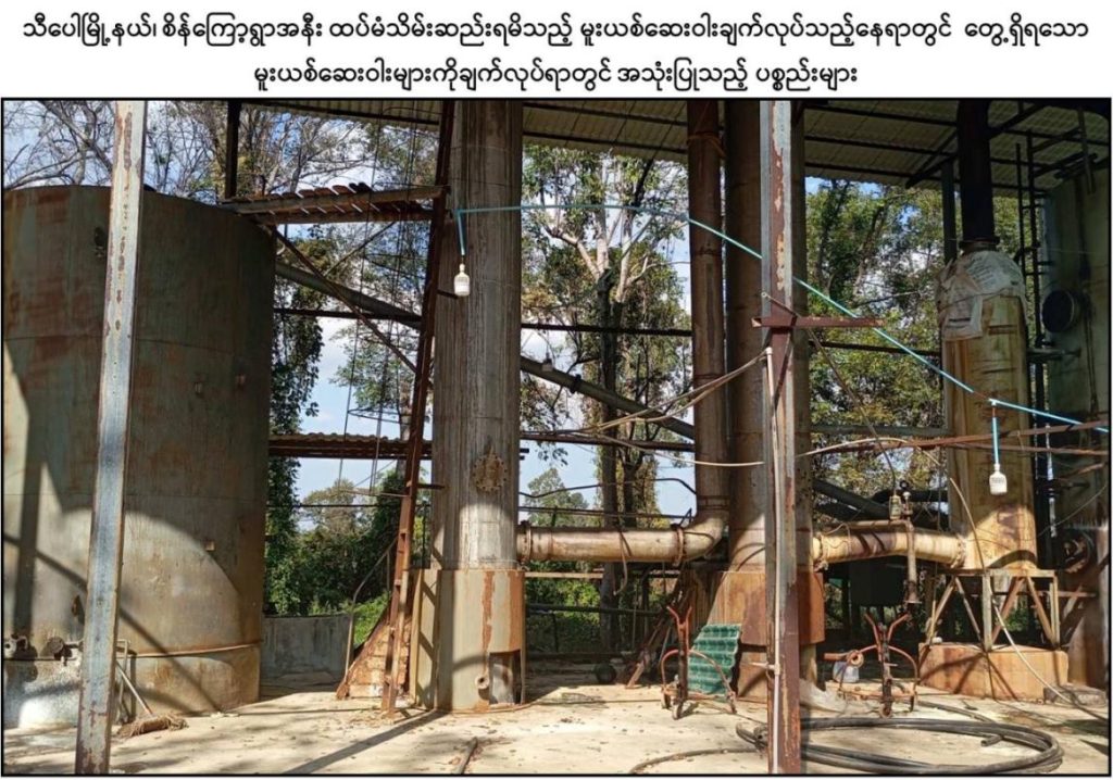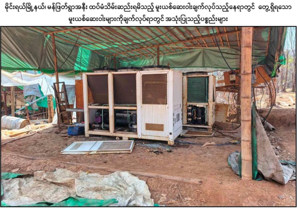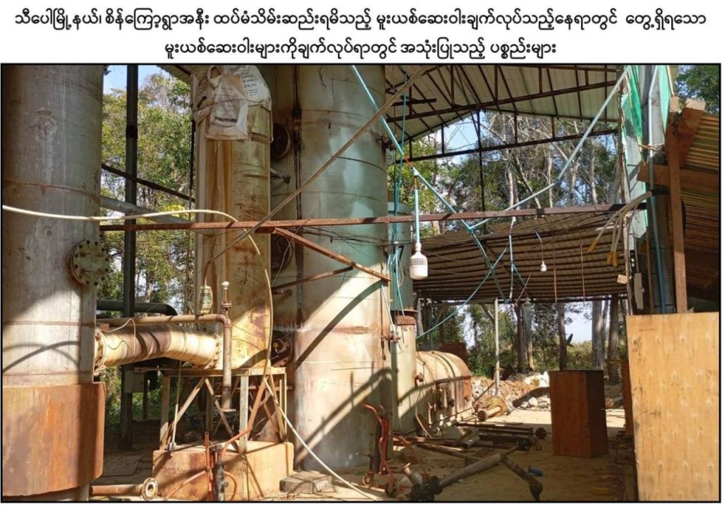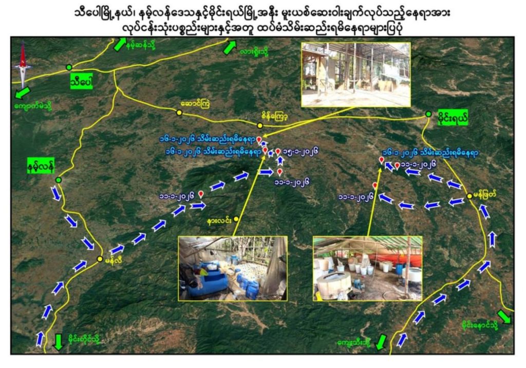 အလားတူ နံနက် ၁၁ နာရီ ၄၅ မိနစ်ခန့်တွင် ယမန်နေ့က ဖမ်းဆီးရမိခဲ့သည့်နေရာ၏ အနောက်မြောက်ဘက် ၂ ကီလိုမီတာခန့်အကွာ ၊ သီပေါ – မိုင်းရယ်သွားကားလမ်းအနီးရှိ စိန်ကြော့ကျေးရွာ၏ အရှေ့တောင်ဘက် ၁၅ ကီလိုမီတာခန့်အကွာတွင် မသင်္ကာဖွယ်ရာ အဆောက်အအုံများတွေ့ရှိရသဖြင့် သွားရောက်ရှင်းလင်းခြင်းဆောင်ရွက်ခဲ့ရာ မူးယစ်ဆေးဝါးချက်လုပ်ရာတွင် အသုံးပြုသည့် လူ ၅ ဦးဆန့် လူနေတဲ ၃၅ လုံး၊ Lovon အမျိုးအစား ဘက်ဟိုး ၁ စီး၊ အလျား ၃၀ ပေ၊ အနံ ၁၅ ပေရှိ ဝါးဂိုဒေါင် ၂ လုံး၊ အက်ဆစ် ၁၅ ဂါလံပုံး ၇၀ လုံး၊ အရှည်ပေ ၃၀၀ ခန့်ရှိ တဲ ၁ လုံး၊ အခြောက်ခံဗန်း ၃ ချပ်၊ မူးယစ်ဆေးဝါးချက်လုပ်သည့် ဖို ၃ ခု၊ ဂက်စ်အိုး ၁၅၀ လုံး၊ ကျောက်ချဉ်အိတ် ၁၅၀ လုံး၊ ဆာလဖြူရစ် အက်ဆစ်ထည့်သောပုံးပြာ (အရည်ပါ) ၅၀၀ လုံး၊ ပုံးပြာအခွံ ၁၀၀၀ လုံး၊ ဆာလာအိတ်များဖြင့်ထည့်ထားသည့် Caustic Soda ၁၅၀ အိတ်၊ ဆပ်ပြာခွက်များထည့်ထားသည့် ကတ်ထူဖာ ၃၀၀ ဖာ တို့ကို ရှာဖွေဖော်ထုတ်သိမ်းဆည်းနိုင်ခဲ့ပြီး ထပ်မံ၍ရှာဖွေစစ်ဆေးခြင်းများ ဆောင်ရွက်ခဲ့ရာ မွန်းလွဲ ၁ နာရီခန့်တွင် အဆိုပါနေရာ၏ အနောက်မြောက်ဘက် ၄ ကီလိုမီတာခန့်အကွာ၌ မူးယစ်ဆေးဝါးချက်လုပ်ရာတွင် အသုံးပြုသည့် ဘွိုင်လာအိုး ၂ လုံးပါ အလျား ၉၀ ပေ၊ အနံ ၄၀ ပေရှိ အဆောက်အအုံ ၁ လုံး၊ ရေထည့် Boxer ကန် ၂ လုံး၊ Liugong အမျိုးအစား Loader ၁ စီးနှင့် အလျား ၄၀ ပေ၊ အနံ ၂၀ ပေရှိ လူနေတဲ ၃ လုံးတို့ကို ထပ်မံတွေ့ရှိသိမ်းဆည်းရမိခဲ့သည်။