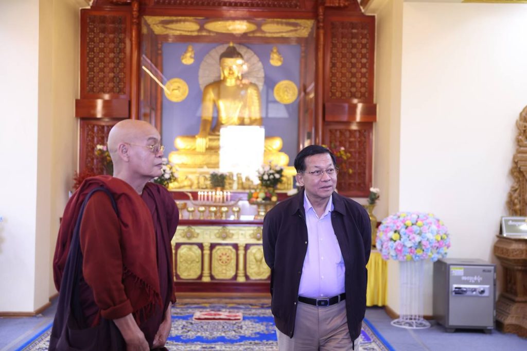 ယာယီသမ္မတနှင့် အဖွဲ့ဝင်များသည် ဗုဒ္ဓဥယျာဉ်ပရိဝုဏ်တော်အတွင်း တည်ထားကိုးကွယ်မည့် လောကသရဖူစေတီတော်မြတ်ကြီး တည်ဆောက်ရေးလုပ်ငန်းသို့ ရောက်ရှိကြပြီး မြေကြီးလုပ်ငန်းများ ဆောင်ရွက်ထားရှိမှု၊ ပင်မစေတီတော်တည်ဆောက်ခြင်း၊ ရင်ပြင်ကြမ်းခင်းခြင်း၊ အရံစေတီများ တည်ဆောက်ခြင်း၊ ပစ္စယံများကျောက်စီခြင်းလုပ်ငန်း ဆောင်ရွက်ပြီးစီးမှုအခြေအနေများကို ကြည့်ရှုပြီးနောက် ယာယီသမ္မတသည် စေတီတော်ကြီး တည်ဆောက်ရေးလုပ်ငန်းများနှင့် ပတ်သက်၍ ဝစီပိတ်ဆရာတော်ကြီး၏ မိန့်ကြားမှုများအပေါ် လိုအပ်သည်များ တင်ပြလျှောက်ထားကာ စေတီတော်ကြီး တည်ဆောက်ရေးလုပ်ငန်းခွင်အတွင်း လှည့်လည်ကြည့်ရှုပြီး လိုအပ်သည်များ လမ်းညွှန်မှာကြားသည်။