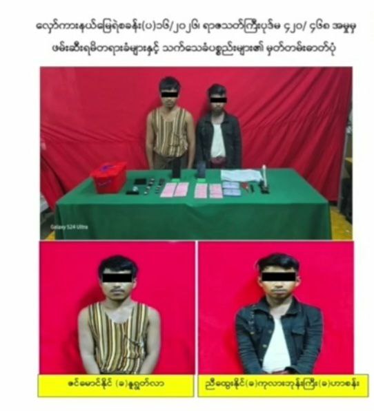 လှိုင်သာယာ(အရှေ့ပိုင်း)မြို့နယ်၊ အမှတ် (၂)ရပ်ကွက်၊ ဗထူး (၁၁) လမ်းတွင် ဇန်နဝါရီ ၁၄ ရက် ညနေ ၆ နာရီခန့်က ဝင်ရောက်ဖမ်းဆီးခဲ့ရာ ဂျင်မီအောင်(ခ)ကုလားကြီး(ခ)ဟာရွန်နှင့် ကျော်ထက်အောင်တို့ကို သက်သေခံပစ္စည်းများနှင့် အတူဖမ်းဆီးရမိခဲ့ကြောင်း သိရသည်။
