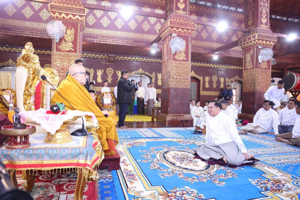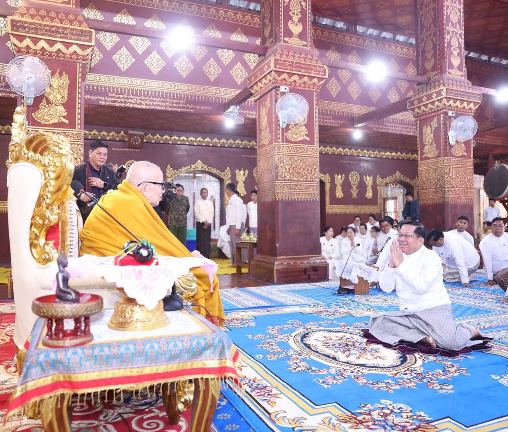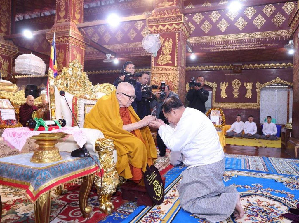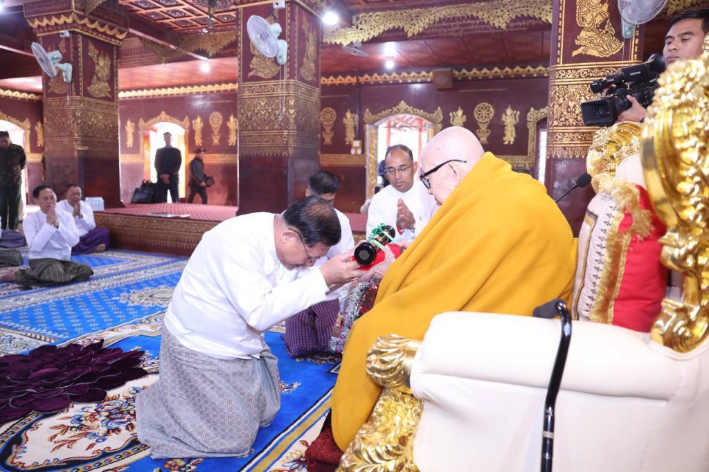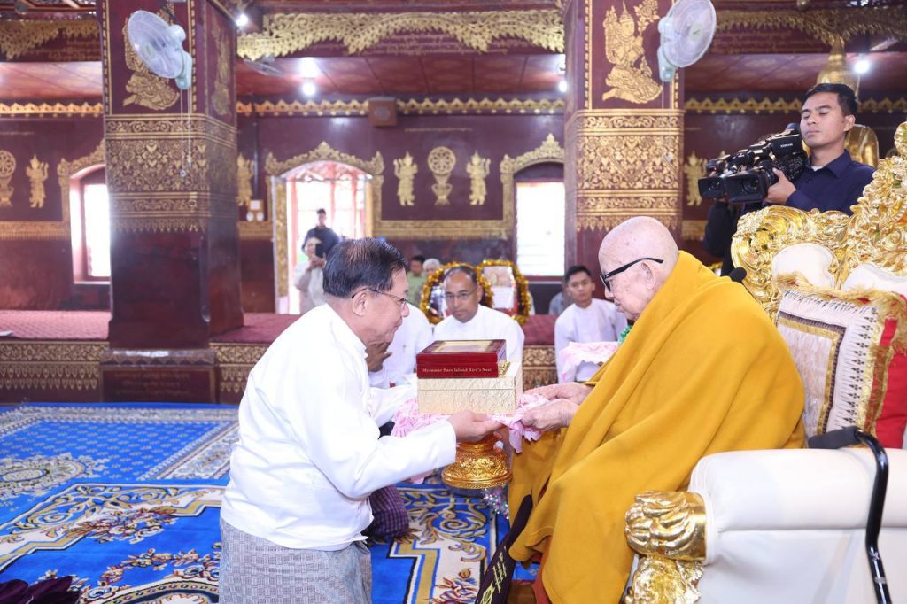 ကျိုင်းယင်းကျောင်းတိုက် ဦးစီးပဓာနနာယက၊ အဂ္ဂမဟာ သဒ္ဓမ္မဇောတိကဓဇ ဘဒ္ဒန္တခေမာစာရ သက်တော်ရှည်မဟာထေရ်မြတ်ကြီးထံ “စည်သူဘွဲ့” တံဆိပ်တော်နှင့် အဆောင်အယောင်များ၊ လှူဖွယ်ပစ္စည်းများ၊ နဝကမ္မအလှူတော်ငွေများကို ယာယီသမ္မတက ဆက်ကပ်လှူဒါန်းပြီးနောက် ဆရာတော်ကြီးက ယာယီသမ္မတထံ ဓမ္မလက်ဆောင် ပြန်လည်ပေးအပ်သည်။
