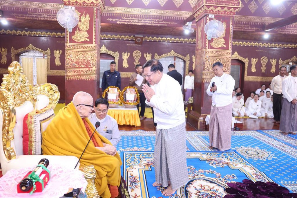 “စည်သူဘွဲ့”တံဆိပ်တော်ရ ကျိုင်းတုံမြို့၊ ကျိုင်းယင်းကျောင်းတိုက် ဦးစီးပဓာနနာယက၊ အဂ္ဂမဟာသဒ္ဓမ္မ ဇောတိကဓဇ ဘဒ္ဒန္တခေမာစာရ သက်တော်ရှည် မဟာထေရ်မြတ်ကြီးအား ဘွဲ့တံဆိပ်တော်နှင့် အဆောင်အယောင်များ ဆက်ကပ်လှူဒါန်းခြင်း မင်္ဂလာအခမ်းအနားကို ယနေ့တွင် ကျိုင်းယင်းကျောင်းတိုက်၊ ဓမ္မာရုံတော်ကြီး၌ ကျင်းပပြုလုပ်ရာ နိုင်ငံတော်ယာယီသမ္မတ နိုင်ငံတော်လုံခြုံရေးနှင့် အေးချမ်းသာယာရေးကော်မရှင်ဥက္ကဋ္ဌ ဗိုလ်ချုပ်မှူးကြီးမင်းအောင်လှိုင် တက်ရောက်၍ လက်ရောက်ဆက်ကပ်လှူဒါန်းသည်။