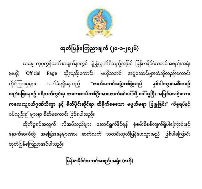 ◾ ကျူးလွန်သည့်ဇာတ်သဘင်အဖွဲ့နာမည် မဖော်ပြရဲသည့် မြန်မာနိုင်ငံသဘင်အစည်းအရုံး(ဗဟို) ကိုလည်း ထုတ်ပြန်ချက်အောက် ရှုတ်ချနေ