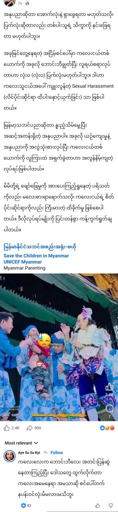 ထိုဖြစ်ရပ်အပေါ် မြန်မာနိုင်ငံသဘင်အစည်းအရုံး(ဗဟို) က ယနေ့ထုတ်ပြန်ရာတွင် “ယနေ့ လူမှုကွန်ယက်စာမျက်နှာတွင် ပျံ့နှံ့လျက်ရှိသည့်အပြင် မြန်မာနိုင်ငံသဘင်အစည်းအရုံး (ဗဟို) Official Page သို့လည်းကောင်း၊ ဗဟိုသဘင် အမှုဆောင်များထံသို့လည်းကောင်း တိုင်ကြားမှုများ လက်ခံရရှိနေသည့် “ဇာတ်သဘင်အဖွဲ့တစ်ဖွဲ့သည် နှစ်ပါးသွားအစီအစဉ် ဖျော်ဖြေနေစဉ် ပရိသတ်တွင်းမှ ကလေးငယ်တစ်ဦးအား ဇာတ်စင်ပေါ်သို့ ခေါ်ယူပြီး အမြင်မသင့်သော၊ ကလေးသူငယ်ဂုဏ်သိက္ခာ နှင့် စိတ်ပိုင်းဆိုင်ရာ ထိခိုက်စေသော မဖွယ်မရာ ပြုမူခြင်း” ကိစ္စရပ်နှင့် စပ်လျဉ်း၍ များစွာ စိတ်မကောင်း ဖြစ်ရပါသည်။