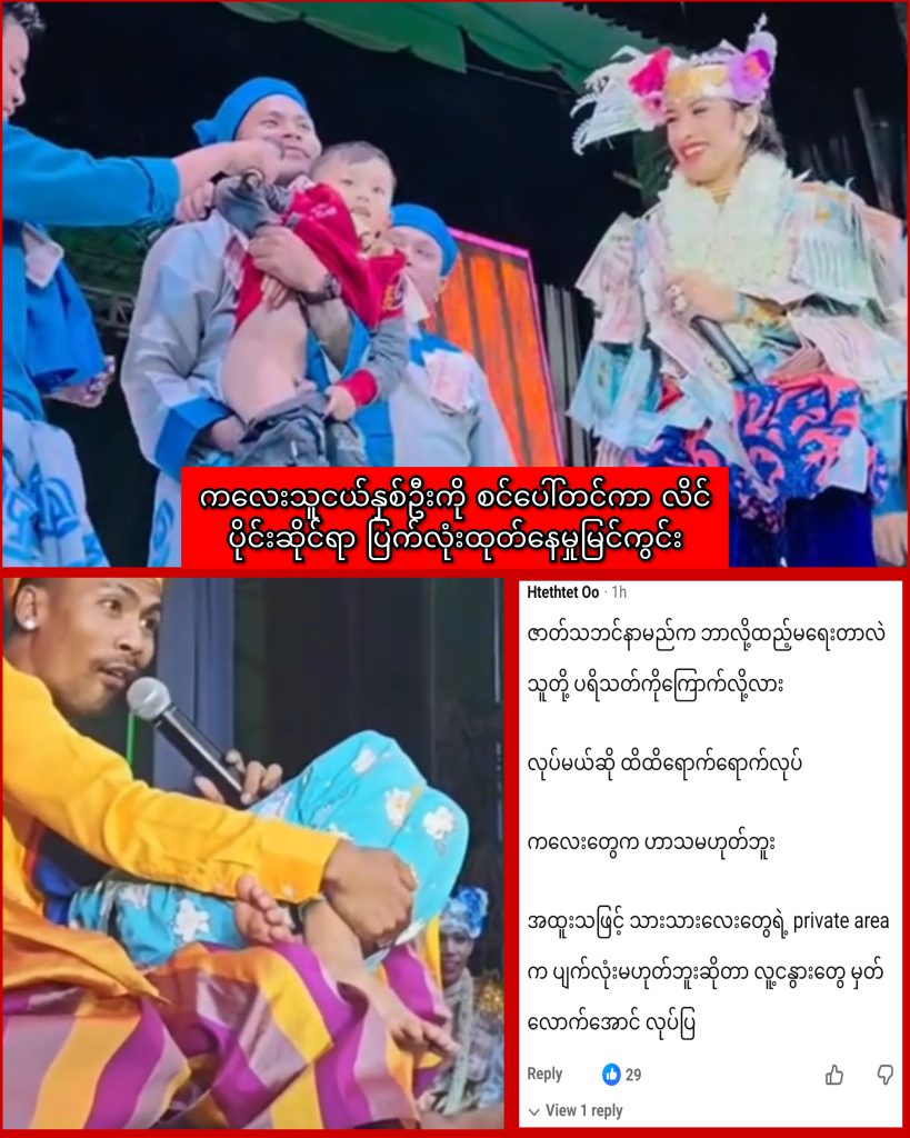 ကလေးသူငယ်များကို စင်ပေါ်ခေါ်တင်ကာ ဘောင်းဘီဆွဲချွတ်ပြီး လိင်ပိုင်းဆိုင်ရာ စော်ကားသည့်လုပ်ရပ်များကို ပြက်လုံးထုတ်သည့် အောင်ဇမ္ဗူဇာတ်အဖွဲ့အား စုံစမ်းစိစစ်မည်ဖြစ်ကြောင်း မြန်မာနိုင်ငံသဘင်အစည်းအရုံး(ဗဟို) က ယနေ့ထုတ်ပြန်သည်။