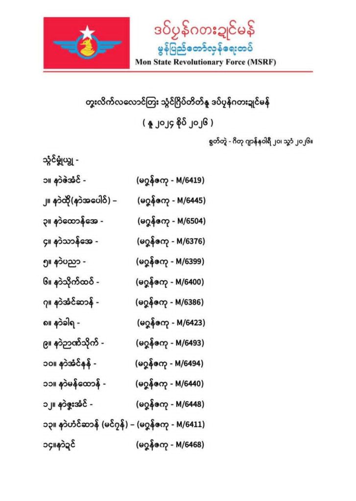 လူထုကို လက်နက်အားကိုးနှိပ်စက်ကာ မြို့သိမ်းတိုက်ပွဲများဖြင့် မြို့ဖျက်နေသော လက်နက်ကိုင်လမ်းစဥ်ကို မယုံကြည်တော့သဖြင့် မွန်ပြည်တော်လှန်ရေးတပ်မှ ထွက်ပြေးသွားသူများမှာ ရဲဘော် နိုင်ဇွဲအောင် (M/6419)၊ နိုင်ထွီး (ခ) အပေါ (M/6445)၊ နိုင်ထွန်အေး (M/6504)၊ နိုင်စန်းအေး (M/6376)၊ နိုင်ပညာ (M/6399)၊ နိုင်သိုက်ထော (M/6400)၊ နိုင်အောင်ချမ်း (M/6386)၊ နိုင်ခါရ (M/6423)၊ နိုင်ဉာဏ်သိုက် (M/6493)၊ နိုင်အောင်းနွန် (M/6494)၊ နိုင်မင်းထွန်း (M/6440)၊ နိုင်အောင်းဇန (M/6448)၊ နိုင်ဟောင်းချမ်း (ခ) မင်ဂလွမ် (M/6411)၊ နှင့် နိုင်ဒင် (M/6468)တို့ဖြစ်သည်ဟုလည်း မွန်ပြည်တော်လှန်ရေးတပ်က ဝန်ခံပြီး ထိုတပ်ပြေးများတွင် အရာရှိအဆင့်အချို့လည်း ပါဝင်သည်။