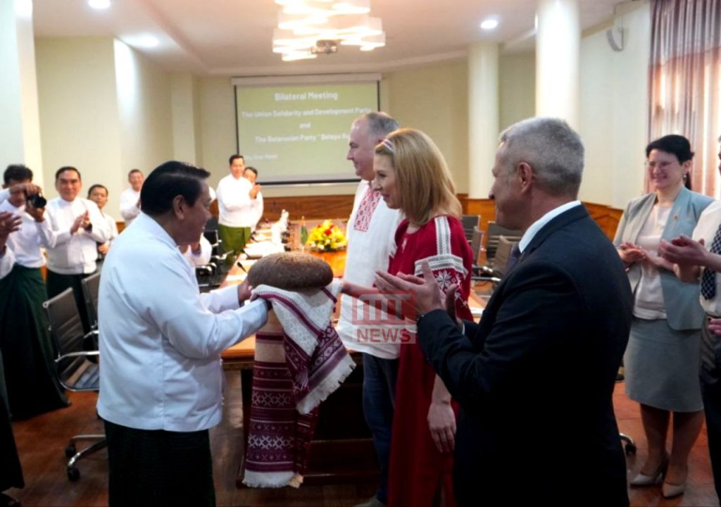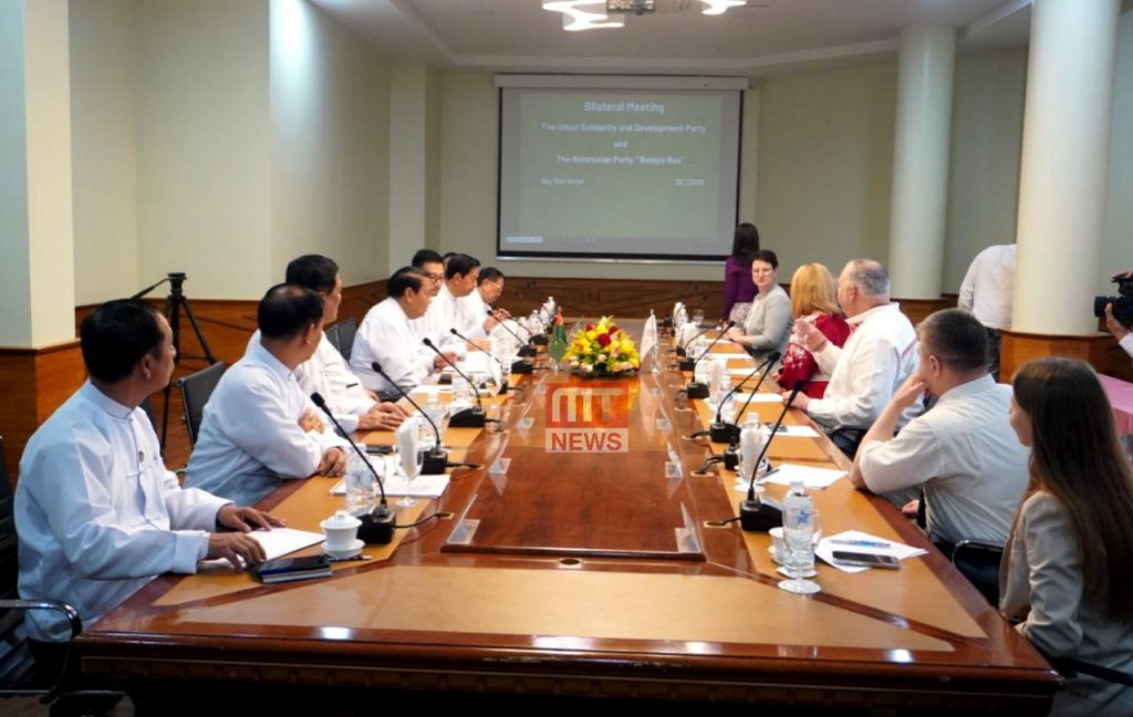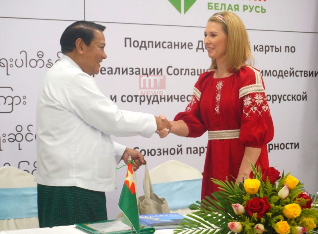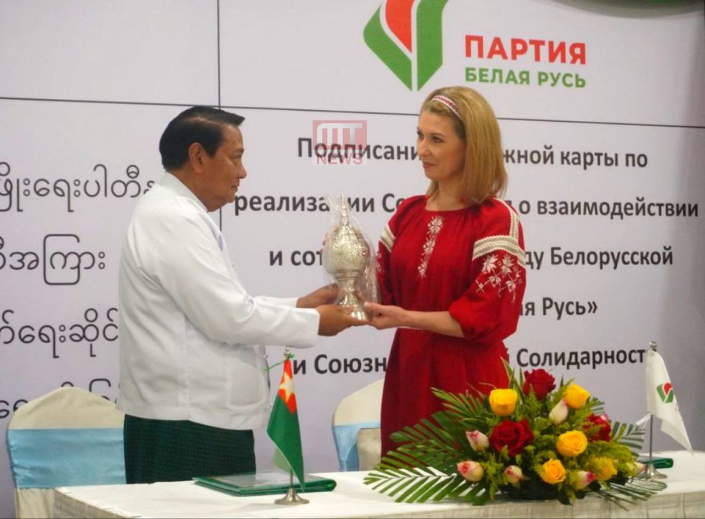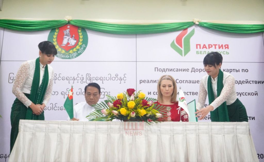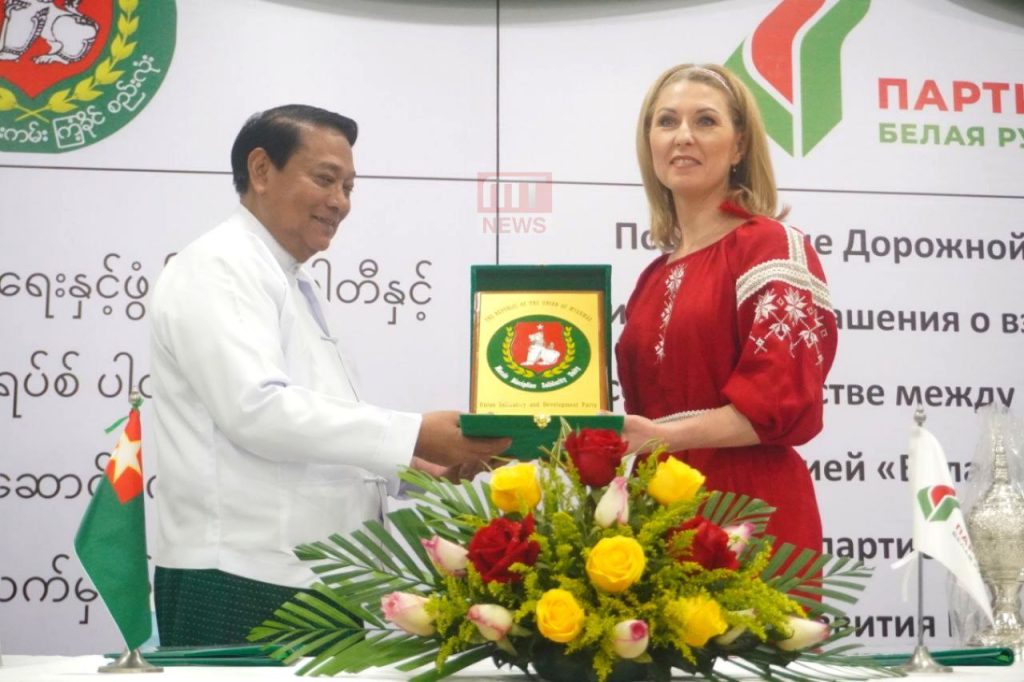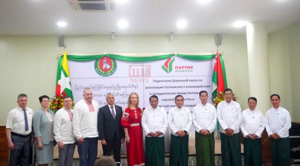 ပြည်ထောင်စုကြံ့ခိုင်ရေးနှင့် ဖွံ့ဖြိုးရေးပါတီ (USDP) နှင့် ဘယ်လာယာရပ်စ် (Belaya Rus) ပါတီတို့အကြား ပါတီချင်းပူးပေါင်းဆောင်ရွက်ရေးဆိုင်ရာ လုပ်ငန်းစဉ်များ လက်မှတ်ရေးထိုးခြင်း အခမ်းအနားကို ယနေ့တွင် ရန်ကုန်မြို့ရှိ Sky Star Hotel ၌ ကျင်းပခဲ့သည်။