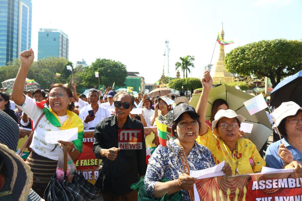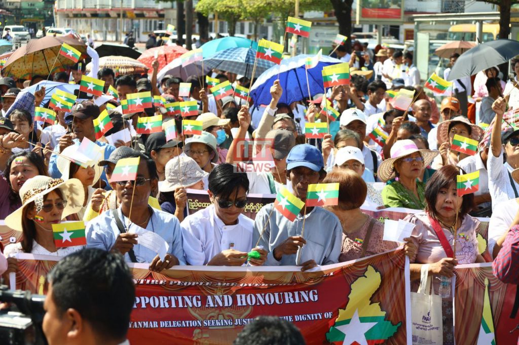 အဆိုပါထောက်ခံပွဲနှင့် ဆန္ဒထုတ်ဖော်ပွဲတွင် ကြွေးကြော်သံများအဖြစ် “(၁) ပြည်ထောင်စုသမ္မတမြန်မာနိုင်ငံတော်၏ ဂုဏ်သိက္ခာနှင့် တရားမျှတသော အမှန်တရားအတွက် အပြည်ပြည်ဆိုင်ရာတရားရုံး (ICJ)တွင် ရင်ဆိုင်ဖြေရှင်းနေသော မြန်မာကိုယ်စားလှယ်အဖွဲ့… အောင်မြင်ပါစေ။ (၂) လူမျိုးသုဉ်းသတ်ဖြတ်သည်ဟု မဟုတ်မမှန် စွပ်စွဲနေကြသူများအား… အလိုမရှိ၊ (၃) လူမျိုးသုဉ်းသတ်ဖြတ်သည်ဟု သက်သေခိုင်လုံခြင်းမရှိဘဲ စွပ်စွဲနေမှုများ… ချက်ချင်းရပ်” စသည့်ကြွေးကြော်သံသုံးချက်ဖြင့် တက်ရောက်လာသူများက ဆန္ဒထုတ်ဖော်ခဲ့ကြသည်။