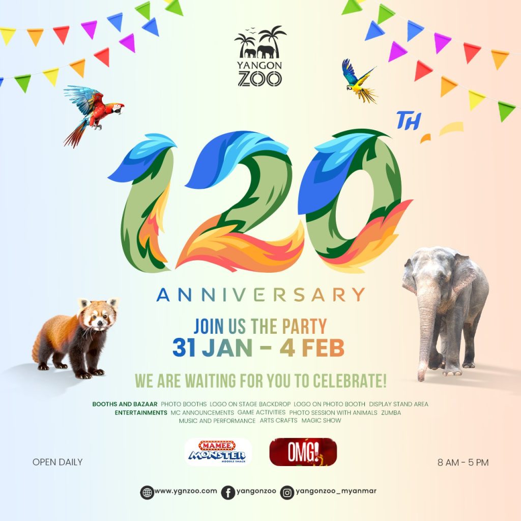 ရန်ကုန်တိရစ္ဆာန်ဥယျာဥ်၏ မကြာခင်ကျရောက်တော့မည့် သက်တမ်း ၁၂၀ နှစ်ပြည့် အထိမ်းအမှတ်ပွဲတော် ဖွင့်ပွဲအခမ်းအနားကို ဇန်နဝါရီ ၃၁ ရက်တွင် ကျင်းပမည်ဖြစ်ပြီး ဖေဖော်ဝါရီ ၁ ရက်မှ ၄ ရက်အထိ ဈေးရောင်းပွဲတော်၊ အဆို၊ အက၊ မျက်လှည့်တို့အပြင် ကလေးငယ်များအတွက် Talk Show စသည်တို့ကို ပြုလုပ်သွားမည်ဖြစ်ကြောင်း Yangon Zoo က ဖော်ပြထားသည်။