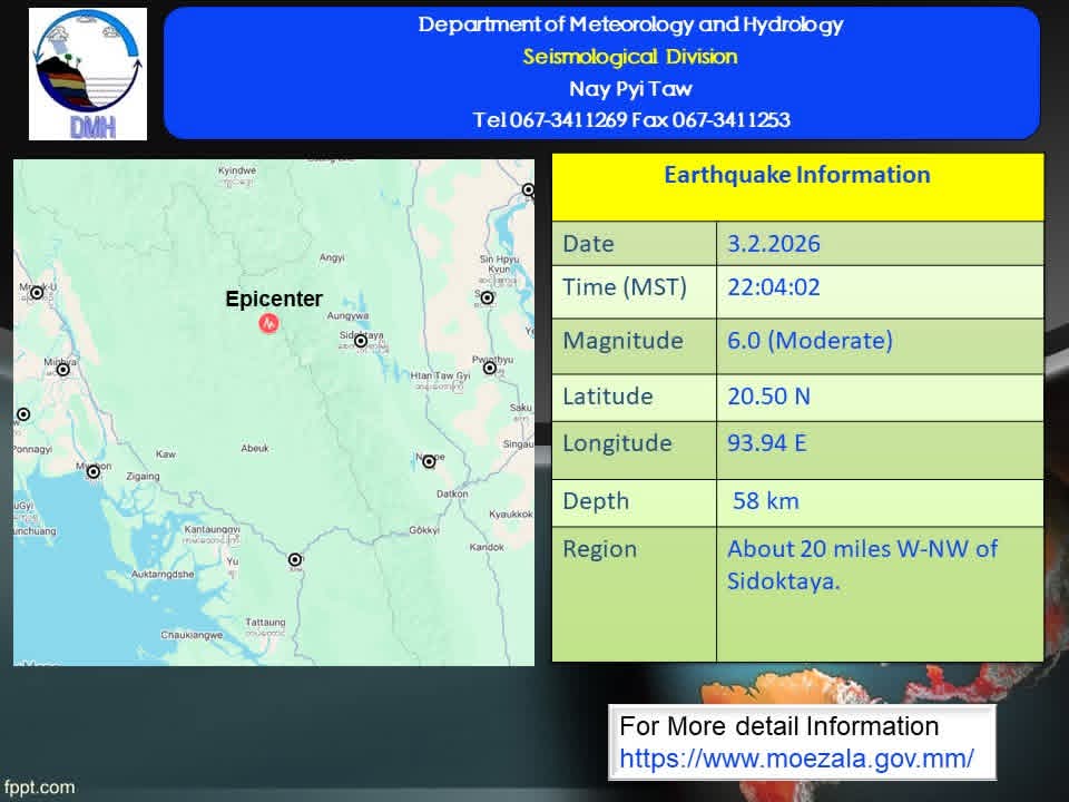 ငလျင်လှုပ်ခတ်မှုမှာ၂၀၂၆ ခုနှစ်၊ ဖေဖော်ဝါရီလ ၃ ရက်နေ့၊ မြန်မာစံတော်ချိန် (၂၂) နာရီ၊ (၀၄) မိနစ်၊ (၀၂) စက္ကန့်အချိန်တွင် စစ်တွေမြေငလျင်စခန်းမှ အရှေ့-အရှေ့မြောက်ဘက် (၇၃) မိုင်ခန့်ကွာဝေးသော မြန်မာနိုင်ငံ ပြည်တွင်း (စေတုတ္တရာမြို့၏ အနောက်-အနောက်မြောက်ဘက် (၂၀) မိုင်ခန့်အကွာ)၊ မြောက်လတ္တီတွဒ် (၂၀.၅၀) ဒီဂရီ၊ အရှေ့လောင်ဂျီတွဒ် (၉၃.၉၄) ဒီဂရီ၊ အနက် (၅၈) ကီလို မီတာကို ဗဟိုပြု၍ အင်အား ရစ်(ခ်)တာစကေး (၆.၀) အဆင့်ရှိ အင်အားအတင့်အသင့်ရှိသော မြေငလျင်တစ်ခု လှုပ်ရှားသွားကြောင်း သိရသည်။
