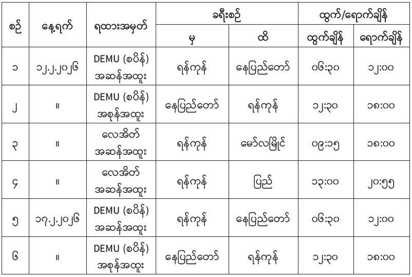 ဖေဖော်ဝါရီ ၁၇ ရက်တွင် DEMU (စပိန်အထူးရထား)ဖြင့် ရန်ကုန်-နေပြည်တော်ခရီစဉ်အား နံနက် ၆ နာရီခွဲနှင့် နေပြည်တော်-ရန်ကုန်ခရီးစဉ်အား နေ့လယ် ၁၂ နာရီခွဲ ထွက်ခွာမည်ဖြစ်သည်။ မော်လမြိုင်-ရန်ကုန်ခရီးစဉ်အား နံနက် ၉ နာရီတွင်လည်းကောင်း၊ ပြည်-ရန်ကုန်ခရီးစဉ်အား ည ၁၀ နာရီခွဲတွင်လည်းကောင်း ပြေးဆွဲပေးမည်ဖြစ်သည်။