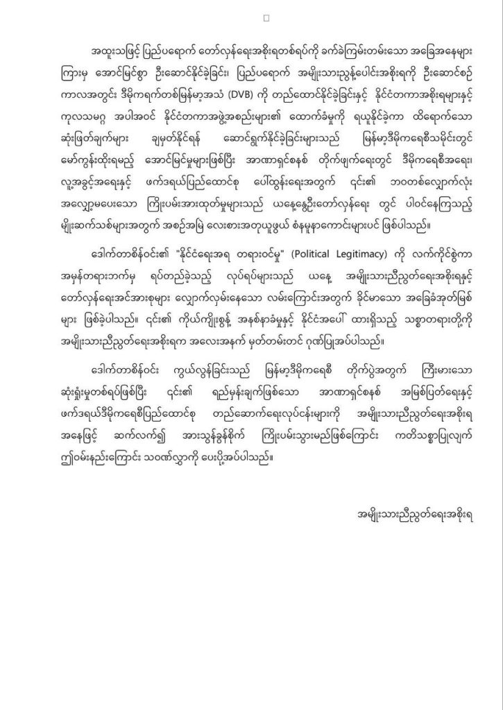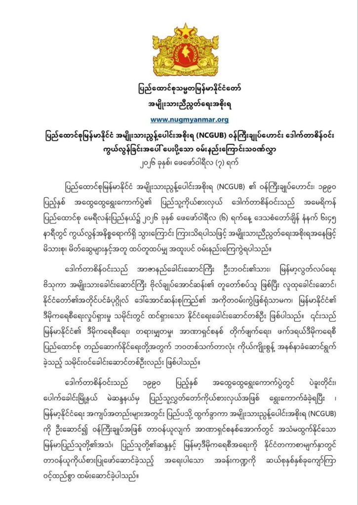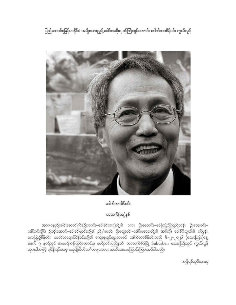 NCGUB ၏ ဝန်ကြီးချုပ်ဟောင်း၊ ၁၉၉၀ ပြည့်နှစ် အထွေထွေရွေးကောက်ပွဲ၏ ပြည်သူ့ကိုယ်စားလှယ် ဒေါက်တာစိန်ဝင်းသည် အမေရိကန် ပြည်ထောင်စု မေရီလန်းပြည်နယ်၌ ၂၀၂၆ ခုနှစ် ဖေဖော်ဝါရီလ (၆) ရက်နေ့ ဒေသစံတော်ချိန် နံနက် ၆း၄၅ နာရီတွင် ကွယ်လွန်သွားသဖြင့် အထူးဝမ်းနည်းကြေကွဲရသည်ဟုလည်း NUG က ကြေညာသည်။