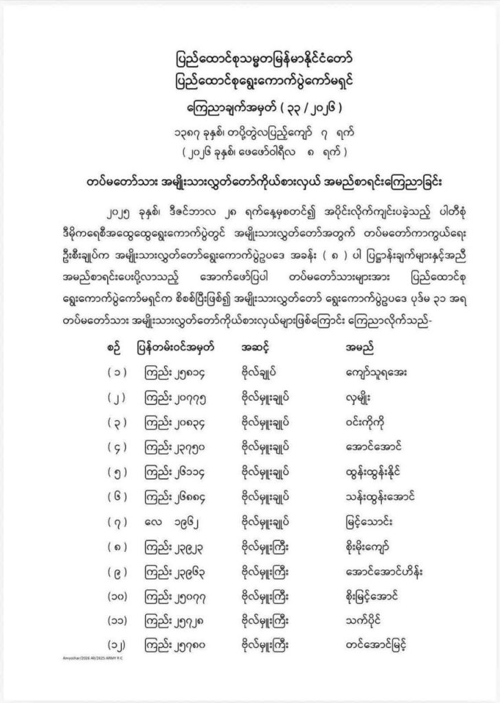 ၂၀၂၅ ခုနှစ်၊ ဒီဇင်ဘာလ ၂၈ ရက်နေ့မှစတင်၍ အပိုင်းလိုက်ကျင်းပခဲ့သည့် ပါတီစုံ ဒီမိုကရေစီအထွေထွေရွေးကောက်ပွဲတွင် အမျိုးသားလွှတ်တော်အတွက် တပ်မတော်ကာကွယ်ရေး ဦးစီးချုပ်က အမျိုးသားလွှတ်တော်ရွေးကောက်ပွဲဥပဒေ အခန်း ( ၈ ) ပါ ပြဋ္ဌာန်းချက်များနှင့်အညီ အမည်စာရင်းပေးပို့လာသည့် တပ်မတော်သား ၅၆ ဦးအား ပြည်ထောင်စု ရွေးကောက်ပွဲကော်မရှင်က စိစစ်ပြီးဖြစ်၍ အမျိုးသားလွှတ်တော် ရွေးကောက်ပွဲဥပဒေ ပုဒ်မ ၃၁ အရ တပ်မတော်သား အမျိုးသားလွှတ်တော်ကိုယ်စားလှယ်များဖြစ်ကြောင်း ကြေညာခဲ့ခြင်းလည်းဖြစ်သည်။