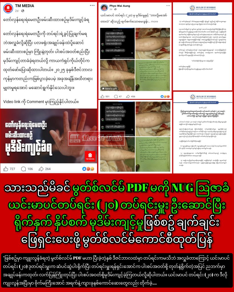 ခင်ပွန်းသည်က PDF ဖြစ်သလို အသက် ၃ နှစ်အရွယ် ရင်သွေးငယ်လည်းရှိတဲ့ သားသည်မိခင် မွတ်စ်လင်မ် PDF မကို NUG ဩဇာခံ ယင်းမာပင်တပ်ရင်း (၂၀) တပ်ရင်းမှူးက ဦးဆောင်ပြီး ရိုက်နှက် နှိပ်စက် မုဒိမ်းကျင့်မှုဖြစ်စဥ် ချက်ချင်းဖြေရှင်းပေးဖို့ မြန်မာနိုင်ငံဆိုင်ရာမွတ်စလင်လူမျိုးစုများအတိုင်ပင်ခံကောင်စီက ထုတ်ပြန်တောင်းဆိုလာပါတယ်။