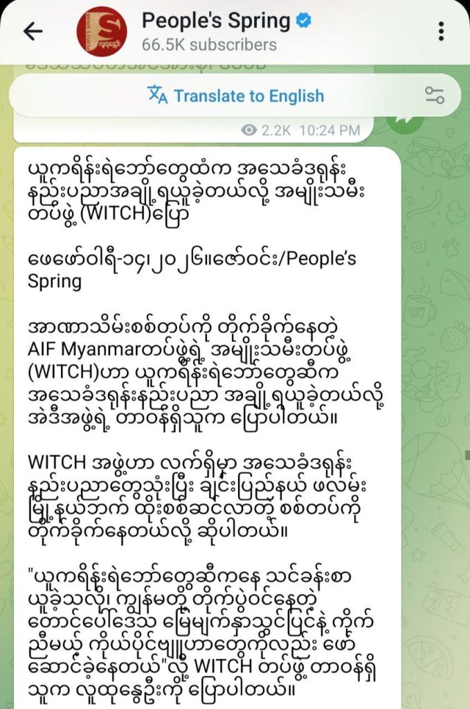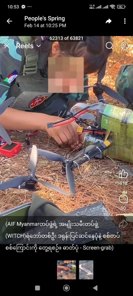 ထို့အတူ AIF Myanmar က ဖွဲ့စည်းထားသည့် Witch အမျိုးသမီးအဖွဲ့ကို ယူကရိန်းရဲဘော်များက ဒရုန်းနည်းပညာသင်တန်းပေးခဲ့သည်ဟု NUG နှင့် PDF များကို ထောက်ခံသော ယခင် 7 Day သတင်းဌာန၏ အယ်ဒီတာချုပ်တစ်ဦးဖြစ်သူ ငြိမ်းငြိမ်းနိုင်တည်ထောင်ထားသည့် People’s Spring သတင်းဌာနက ယခုနှစ် ဖေဖော်ဝါရီ ၁၄ ရက်တွင် “ယူကရိန်းရဲဘော်တွေထံက အသေခံဒရုန်းနည်းပညာအချို့ ရယူခဲ့တယ်လို့ အမျိုးသမီးတပ်ဖွဲ့ (WITCH) ပြော “ခေါင်းစဥ်ဖြင့် ဖော်ပြခဲ့သည်။