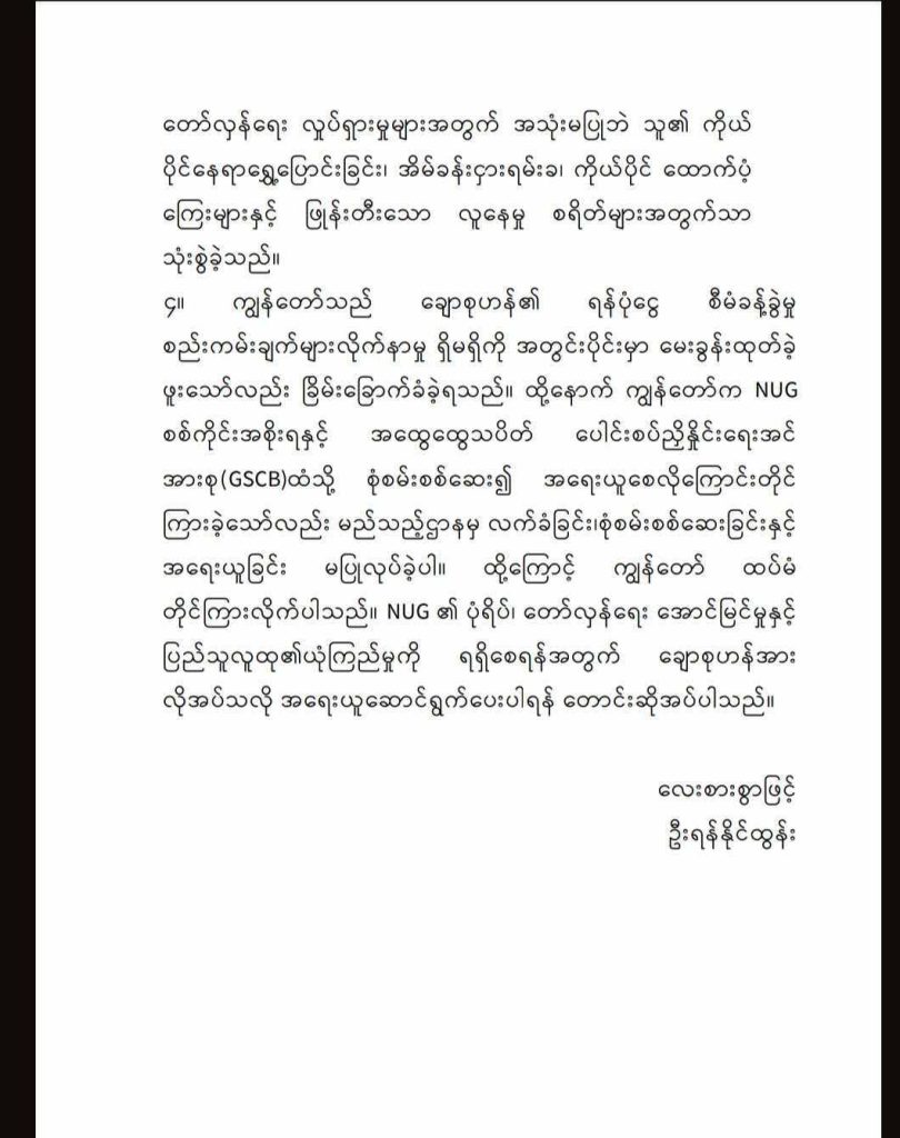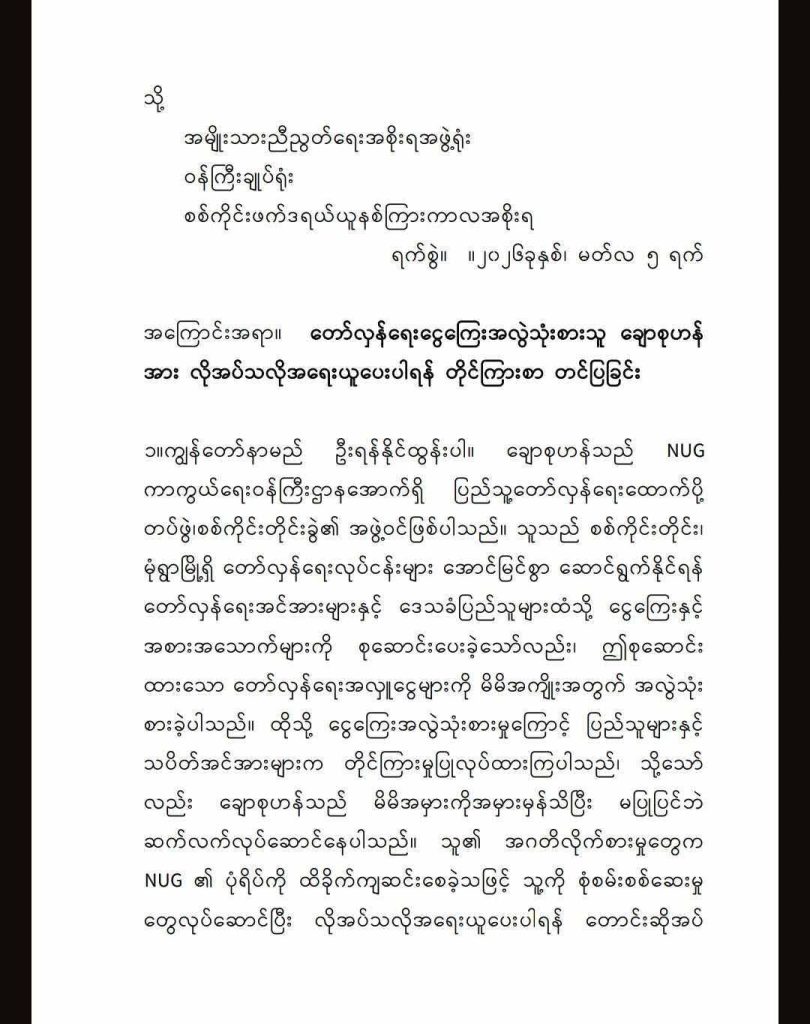 NUG ကာကွယ်ရေးဝန်ကြီးဌာနလက်အောက်ခံ စစ်ကိုင်းတိုင်း၊ မုံရွာမြို့နယ် PDF အဖွဲ့တစ်ခုမှ အဖွဲ့ဝင်ဖြစ်သူ ချောစုဟန်သည် ပြည်သူလူထုလှူဒါန်းငွေများကို ကိုယ်ကျိုးအတွက် အလွဲသုံးစားပြုလုပ်သည်ဟုဆိုကာ ရန်နိုင်ထွန်းဆိုသူက မတ်လ ၅ ရက် ရက်စွဲဖြင့် NUG နှင့် သက်ဆိုင်ရာ အဖွဲ့အစည်းများထံ တိုင်ကြားစာတစ်စောင် ပေးပို့လိုက်သည်။