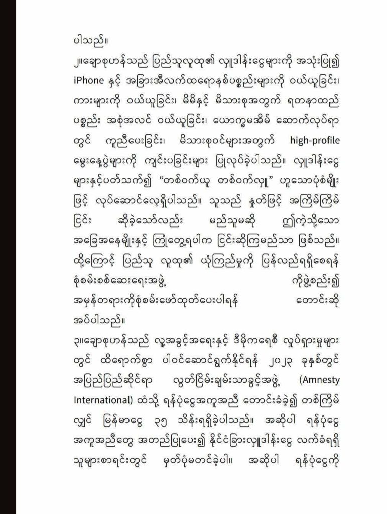 ထို့အပြင် ၂၀၂၃ ခုနှစ်အတွင်း နိုင်ငံတကာလွတ်ငြိမ်း ချမ်းသာခွင့်အဖွဲ့ (Amnesty International) ထံမှ လူ့အခွင့်အရေးလှုပ်ရှားမှုများအတွက် ရရှိခဲ့သော ရန်ပုံငွေ မြန်မာကျပ်ငွေ ၃၅ သိန်းခန့်ကိုလည်း စာရင်းဖျောက်၍ ကိုယ်ကျိုးအတွက် သုံးစွဲခဲ့ကြောင်း ဖော်ပြထားသည်။