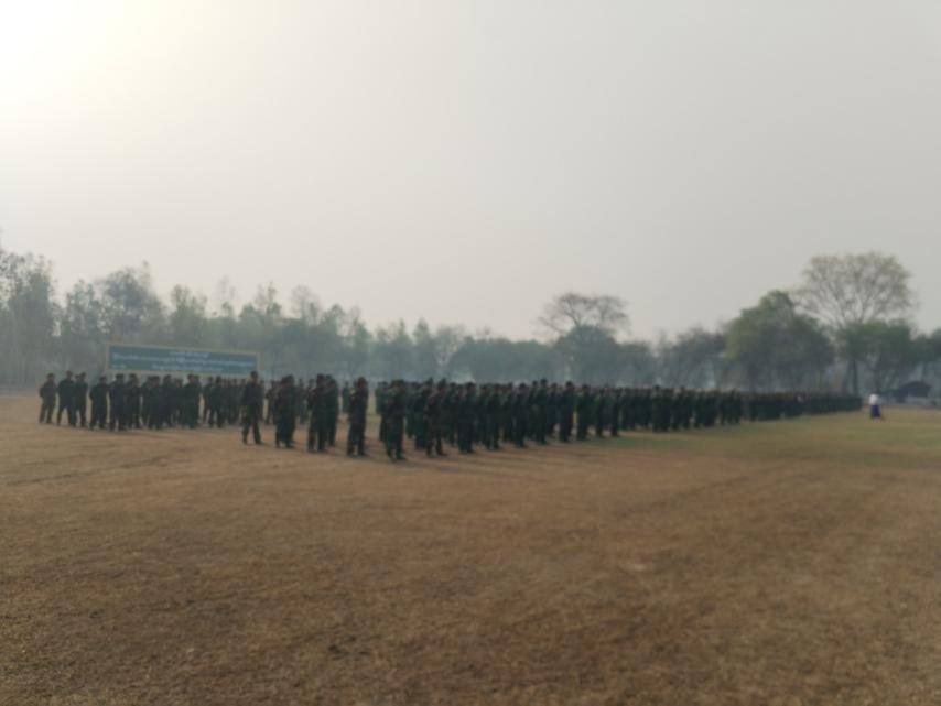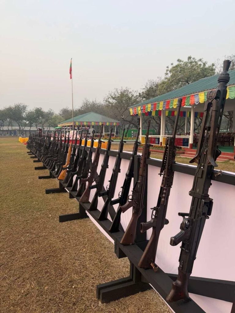 ပုံစာ။ အလယ်ပိုင်းတိုင်းစစ်ဌာနချုပ်တွင် PDF ရာပေါင်းများစွာက လက်နက်ခဲယမ်းအများအပြားဖြင့် ယနေ့ အလင်းဝင်မှုမြင်ကွင်း (Photo – Credit)