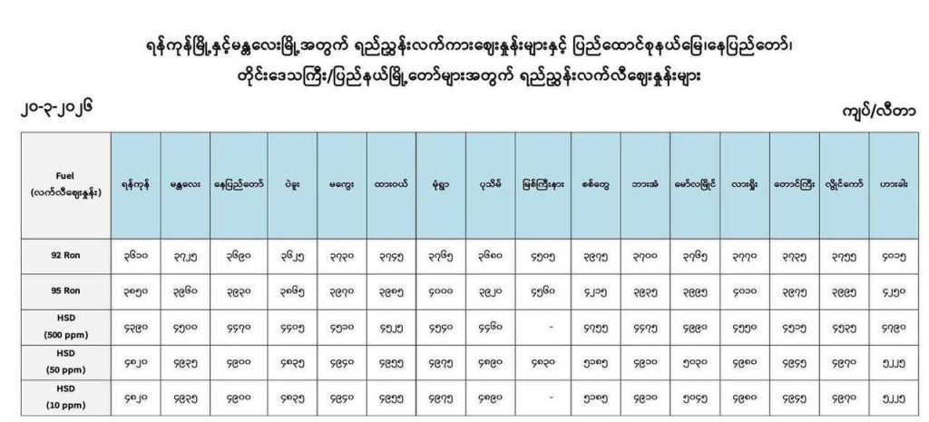 မတ်လ ၂၀ ရက် (ယနေ့)တွင် ဓာတ်ဆီ ၉၂ တစ်လီတာ ၃,၆၁၀ ကျပ်၊ ဓာတ်ဆီ ၉၅ တစ်လီတာ ၃,၈၅၀ ကျပ်၊ ရိုးရိုးဒီဇယ် တစ်လီတာ ၄,၃၉၀ ကျပ်နှင့် ပရီမီယံဒီဇယ် တစ်လီတာ ၄,၈၂၀ ကျပ် ဖြစ်လာသောကြောင့် ဓာတ်ဆီတစ်လီတာ ကျပ် ၇၈၀ မှ ကျပ် ၉၀၀ ကျော်နှင့် ဒီဇယ်တစ်လီတာ ကျပ် ၁၂၀၀ ဝန်းကျင် မြင့်တက်လာခဲခြင်းဖြစ်သည်။