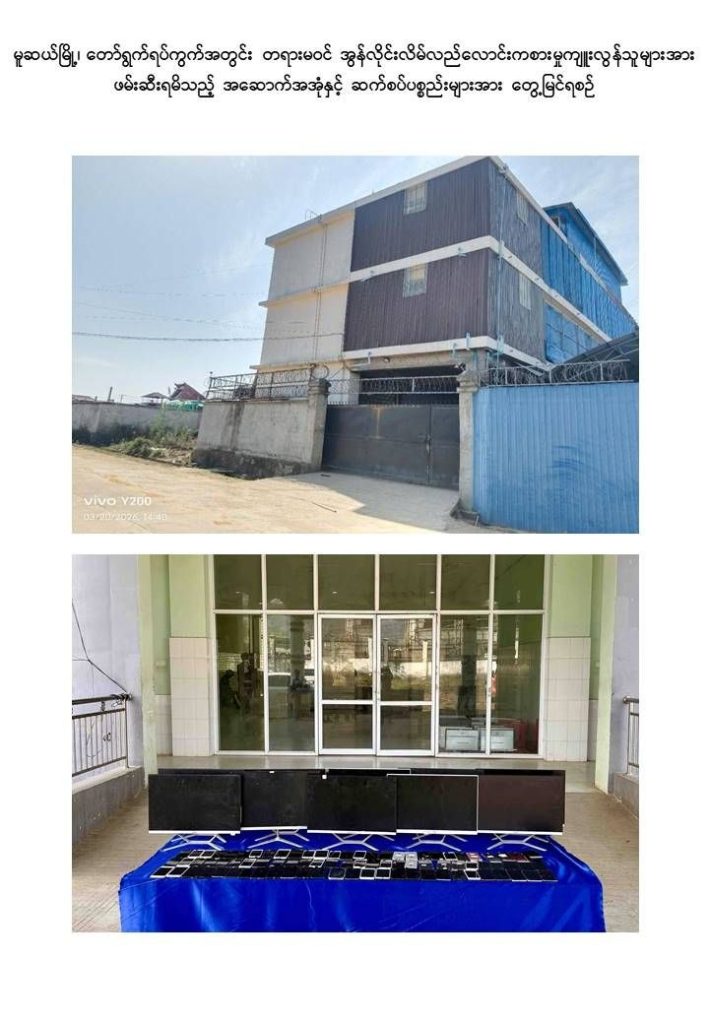 ထိုသို့ဆောင်ရွက်ခဲ့ရာ ကောင်းမှုတုံရပ်ကွက်အတွင်းရှိ နေအိမ်တစ်လုံးအတွင်းမှ အွန်လိုင်းလိမ်လည်လောင်းကစားမှု ကျူးလွန်လျက်ရှိသည့် တရုတ်နိုင်ငံသား ကျား ၈၅ ဦးကို ဖုန်းမျိုးစုံ ၂၈၆ လုံး၊ ကွန်ပျူတာ ၃၀ လုံး၊ Laptop ၂၈ လုံး၊ အဆောက်အဦ ၁ လုံးတို့နှင့်အတူလည်းကောင်း၊ တော်ရွက်ရပ်ကွက်အတွင်းရှိ နေအိမ်တစ်လုံးအတွင်းမှ အွန်လိုင်းလိမ်လည်လောင်းကစားမှု ကျူးလွန်ရာတွင်အသုံးပြုသည့် ဖုန်းမျိုးစုံ ၄၆ လုံး၊ ကွန်ပျူတာ ၁၈ လုံးတို့ကိုလည်းကောင်း၊ စွမ်စော်ရပ်ကွက်အတွင်းရှိ နေအိမ်တစ်လုံးအတွင်းမှ အွန်လိုင်းလိမ်လည်လောင်းကစားမှု ကျူးလွန်ရာတွင်အသုံးပြုသည့် ဖုန်းမျိုးစုံ ၈၅ လုံး၊ ကွန်ပျူတာ ၁၀ လုံးတို့ကိုလည်းကောင်း အသီးသီးဖော်ထုတ်တွေ့ရှိ သိမ်းဆည်းရမိခဲ့သည်။