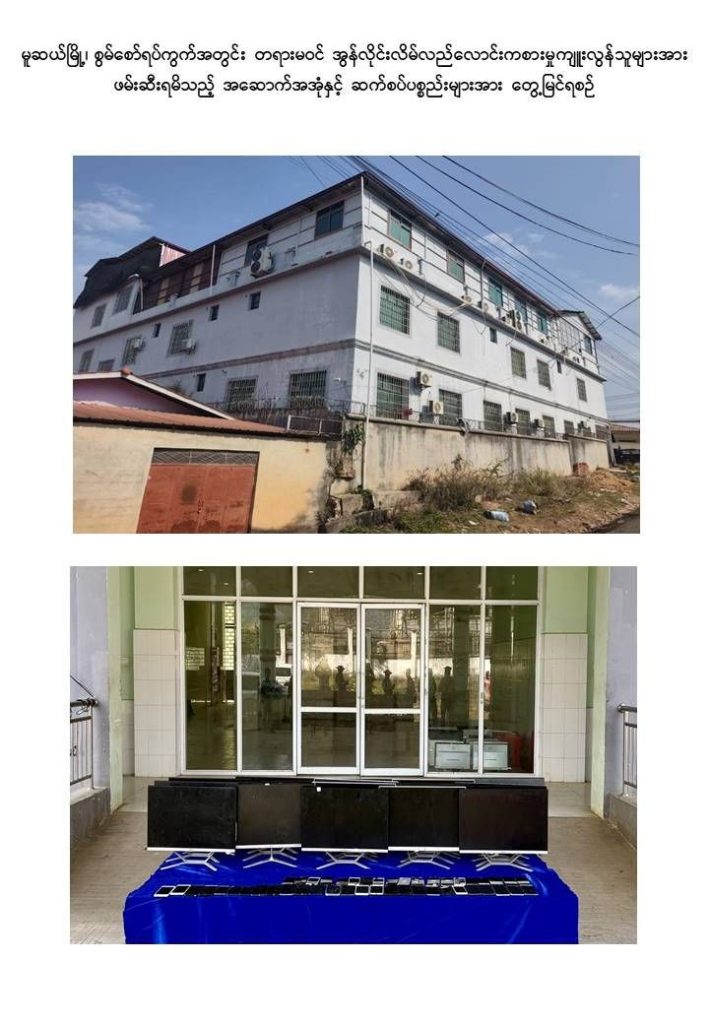 ထို့ပြင် နယ်မြေလုံခြုံရေးဆောင်ရွက်နေသော လုံခြုံရေးတပ်ဖွဲ့ဝင်များသည် ရှမ်းပြည်နယ်(တောင်ပိုင်း)၊ လဲချားမြို့နယ်၊ ကောင်းစံကျေးရွာအနီးတစ်ဝိုက်တွင် နယ်မြေရှင်းလင်းရေးလုပ်ငန်းများဆောင်ရွက်စဉ် ယနေ့ညနေပိုင်း၌ အဆိုပါကျေးရွာ၏ အနောက်ဘက် မီတာ ၃၀၀၀ ခန့်အကွာတွင် အလျား ၁၃၀ ပေ၊ အနံ ၅၀ ပေရှိ အဆောက်အအုံ ၂ လုံး၊ အလျား ၉၀ ပေ၊ အနံ ၃၀ ပေရှိ လူနေအဆောက်အအုံ ၃ လုံး၊ အလျား ၆၀ ပေ၊ အနံ ၃၀ ပေရှိ လူနေအဆောက်အအုံ ၃ လုံး၊ အလျား ၁၅၀ ပေ၊ အနံ ၅၀ ပေရှိ ဂိုဒေါင် ၁ လုံး၊ အလျား ၁၈၀ ပေ၊ အနံ ၆၀ ပေရှိ အဆောက်အအုံ ၁ လုံး၊ Starlink ၁၀ လုံး၊ All in One ကွန်ပျူတာ ၅၅ လုံး၊ Power Station ၁၀ လုံးနှင့် ဆက်စပ်ပစ္စည်းများအား ထပ်မံဖော်ထုတ်သိမ်းဆည်းနိုင်ခဲ့ကြောင်း သိရှိရသည်။