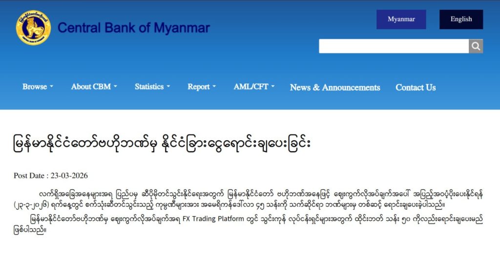 ထို့ကြောင့် ယခုထပ်မံရောင်းချပေးသည့် ဒေါ်လာ ၄၅ သန်းအပါအဝင် ၂၀၂၆ ခုနှစ်၊ မတ်လအတွင်း မြန်မာနိုင်ငံတော်ဗဟိုဘဏ်မှ စက်သုံးဆီလုပ်ငန်းရှင်များသို့ စုစုပေါင်းဒေါ်လာ ၁၄၁ သန်း ရောင်းချပေးထားသည်။ ထို့အတူ ယခု ၂၀၂၅-၂၀၂၆ ဘဏ္ဍာနှစ်အတွင်း စက်သုံးဆီလုပ်ငန်းရှင်များအတွက် ဒေါ်လာ ၁ ဒသမ ၄ ဘီလျံကျော်အထိ ရောင်းချပေးထားပြီးဖြစ်သည်။