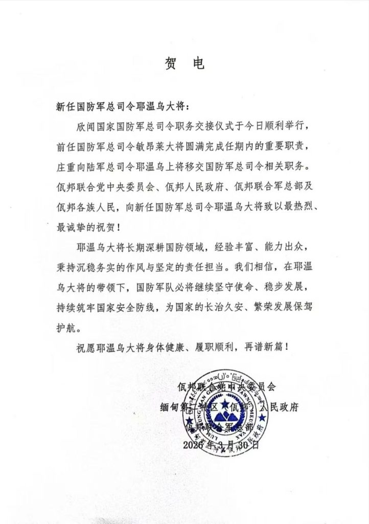 Wa News Land ဖော်ပြလာတဲ့ UWSA ရဲ့ ဂုဏ်ယူဝမ်းမြောက်ကြောင်း သဝဏ်လွှာဟာ တရုတ်စာနဲ့ ရေးသားထားတာဖြစ်ပြီး ဒီသဝဏ်လွှာမှာ “ယနေ့တွင် အမျိုးသားကာကွယ်ရေးတပ်ဖွဲ့များ၏ တပ်မတော် ကာကွယ်ရေးဦးစီးချုပ်၏ ရာထူးလွှဲပြောင်းပေးအပ်ပွဲ အခမ်းအနားကို အောင်မြင်စွာကျင်းပခဲ့ကြောင်း သိရှိရသည့်အတွက် ဂုဏ်ယူဝမ်းမြောက်မိပါသည်။ ရာထူးမှ အနားယူတော့မည့် တပ်မတော် ကာကွယ်ရေးဦးစီးချုပ် ဗိုလ်ချုပ်မှူးကြီး မင်းအောင်လှိုင်သည် ၎င်း၏ အရေးကြီးသောတာဝန်များကို အောင်မြင်စွာ ပြီးမြောက်အောင် ဆောင်ရွက်ခဲ့ပြီး သက်ဆိုင်ရာတာဝန်များကို တပ်မတော် ကာကွယ်ရေးဦးစီးချုပ် ဗိုလ်ချုပ်ကြီး ရဲဝင်းဦးထံ လေးနက်စွာ လွှဲပြောင်းပေးအပ်ခဲ့ပါသည်။ “ဝ” ပြည်သွေးစည်းညီညွတ်ရေးပါတီကော်မတီ၏ ဗဟိုကော်မတီ၊ “ဝ” ပြည်နယ် ပြည်သူ့အစိုးရ၊ “ဝ” ပြည်သွေးစည်းညီညွတ်ရေးတပ်မတော်၊ “ဝ” ပြည်နယ် ပြည်သူတစ်ရပ်လုံးမှ တပ်မတော် ကာကွယ်ရေးဦးစီးချုပ်အသစ် ဗိုလ်ချုပ်ကြီး ရဲဝင်းဦးအား နွေးထွေးပြီး စိတ်ရင်းမှန်ဖြင့် ဂုဏ်ပြုစကားပြောကြားအပ်ပါသည်”လို့ ရေးသား ဖော်ပြထားပါတယ်။