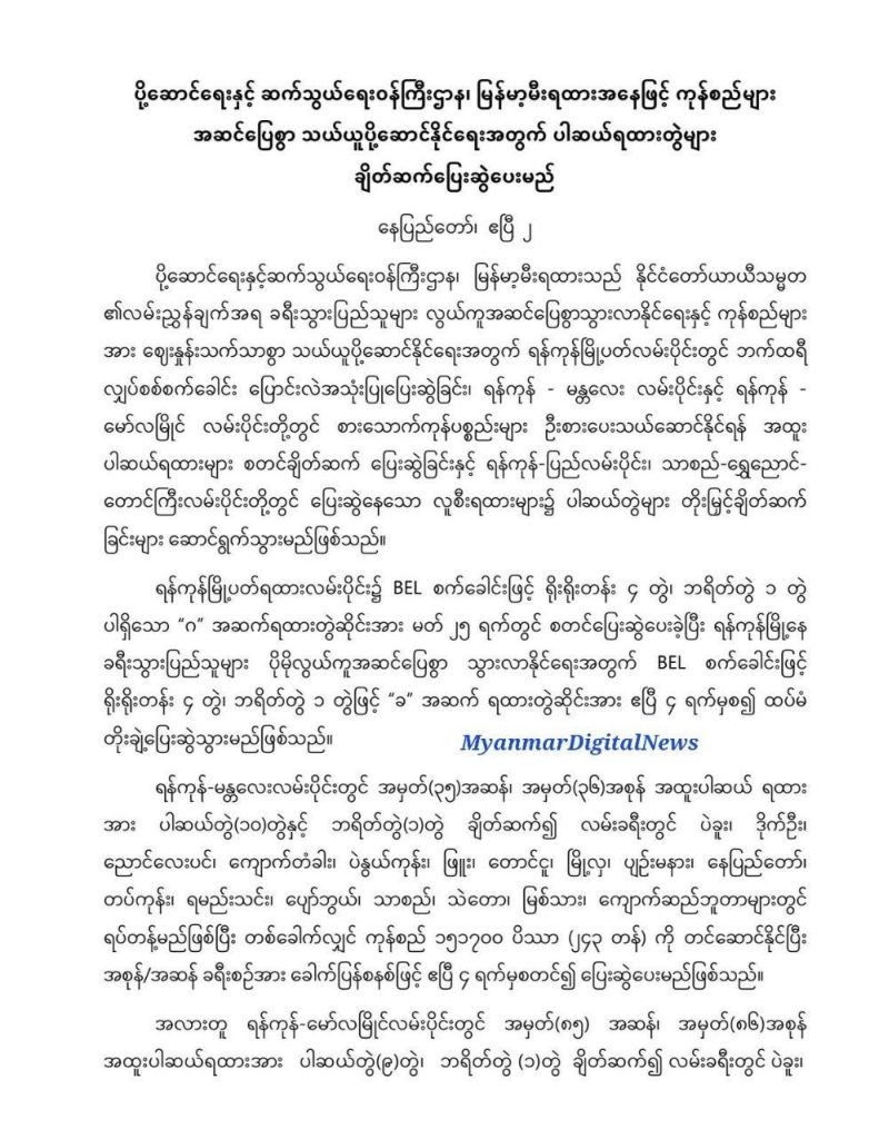 ပို့ဆောင်ရေးနှင့်ဆက်သွယ်ရေးဝန်ကြီးဌာန၊ မြန်မာ့မီးရထားသည် နိုင်ငံတော်ယာယီသမ္မတ၏ လမ်းညွှန်ချက်အရ ခရီးသွားပြည်သူများ လွယ်ကူအဆင်ပြေစွာသွားလာနိုင်ရေးနှင့် ကုန်စည်များအား ဈေးနှုန်းသက်သာစွာ သယ်ယူပို့ဆောင်နိုင်ရေးအတွက် ရန်ကုန်မြို့ပတ်လမ်းပိုင်းတွင် ဘက်ထရီလျှပ်စစ်စက်ခေါင်း ပြောင်းလဲအသုံးပြုပြေးဆွဲခြင်း၊ ရန်ကုန် – မန္တလေး လမ်းပိုင်းနှင့် ရန်ကုန် -မော်လမြိုင် လမ်းပိုင်းတို့တွင် စားသောက်ကုန်ပစ္စည်းများ ဦးစားပေးသယ်ဆောင်နိုင်ရန် အထူးပါဆယ်ရထားများ စတင်ချိတ်ဆက် ပြေးဆွဲခြင်းနှင့် ရန်ကုန်-ပြည်လမ်းပိုင်း၊ သာစည်-ရွှေညောင်-တောင်ကြီးလမ်းပိုင်းတို့တွင် ပြေးဆွဲနေသော လူစီးရထားများ၌ ပါဆယ်တွဲများ တိုးမြှင့်ချိတ်ဆက်ခြင်းများ ဆောင်ရွက်သွားမည်ဖြစ်သည်။