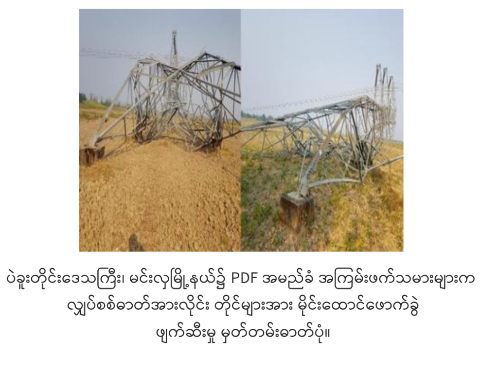 ပဲခူး PDF များ ဖျက်ဆီးလိုက်သော တာဝါတိုင်များ ပြင်ဆင်ပြီးစီးသဖြင့် ဓာတ်အားလိုင်းအတွင်းသို့ မဂ္ဂါဝပ် ၃၀၀ ခန့် ပြန်လည်ပို့လွှတ်နေပြီဖြစ်ကြောင်းနှင့် လက်ရှိအခြေအနေတွင် ဓာတ်အားချွေတာသုံးစွဲပါရန်လည်း မေတ္တာရပ်ခံကြောင်း ရန်ကုန်လျှပ်စစ်ဓာတ်အားပေးရေးကော်ပိုရေးရှင်းက ယနေ့ထုတ်ပြန်သည့် မိဘပြည်သူများထံသို့ ၂၃၀ ကေဗွီ ရွှေတောင် – မြောင်းတကာ အမှတ်(၁+၂) ဓာတ်အားလိုင်း ဓာတ်အားပြန်လည်ပို့လွှတ်ပြီးစီးမှု အသိပေးပန်ကြားစာတွင် ဖော်ပြထားသည်။