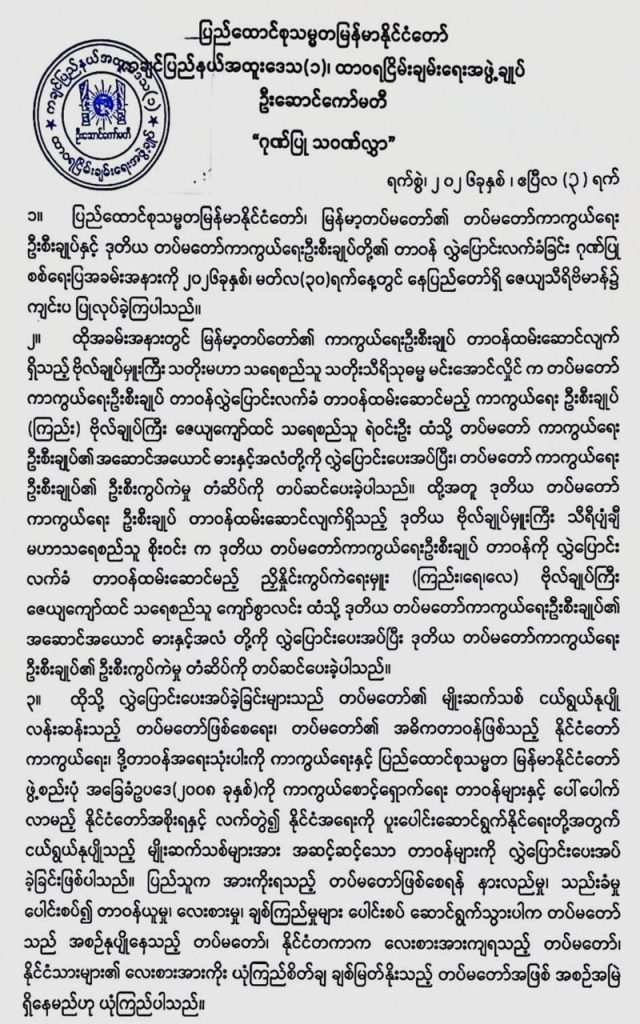 တပ်မတော်၏ တာဝန်များကို လက်ခံရယူထားပြီးဖြစ်သည့် တပ်မတော်ကာကွယ်ရေးဦးစီးချုပ်အသစ်နှင့် ဒုတိယတပ်မတော်ကာကွယ်ရေးဦးစီးချုပ်အသစ်တို့အား ကချင်အထူးဒေသ (၁) ဦးဆောင်ကော်မတီက ဂုဏ်ပြုသဝဏ်လွှာ ပေးပို့သည်။