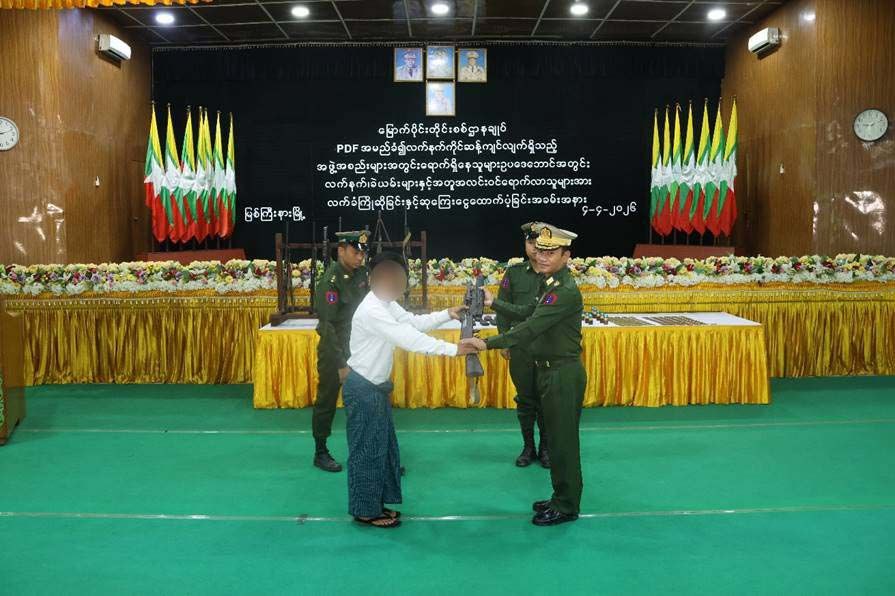 ဦးစွာ ပြည်နယ်ဝန်ကြီးချုပ်က အမှာစကားပြောကြားပြီး တိုင်းမှူးမှ အလင်းဝင်ရောက်လာသူ လူငယ်များအား အသိပညာပေးရှင်းလင်းပြောကြားသည်။ ထို့နောက် ဥပဒေဘောင်အတွင်း ပြန်လည်ဝင်ရောက်ခဲ့ကြသူများက ၎င်းတို့နှင့်အတူ ပါရှိလာသည့် MA-1 သေနတ် ၁ လက်၊ MA-4 သေနတ် ၁ လက်၊ M-22 သေနတ် ၁ လက်၊ K-25 လောင်ချာ ၂ လက်၊ K-25 သေနတ် ၁ လက်၊ M-23 စက်လက် ၁ လက်၊ M-B0 တရုတ်စက်လက် ၁ လက်၊ Type-81 သေနတ် ၁ လက်၊ MG-1 လက်ပစ်ဗုံး ၁ လုံး၊ ၄၀ မမဗုံးသီး ၁၀ လုံး၊ ၅ ဒသမ ၅၆ မမကျည် ၃၂၆ တောင့်၊ ၇ ဒသမ ၆၂ မမ ကျည် ၄၀၅ တောင့်၊ ကျည်ခါးပတ်တွဲ ၁ ခု၊ ကျည်အိမ်မျိုးစုံ ၁၅ ခုနှင့် ဆက်စပ်ပစ္စည်းများကို လွှဲပြောင်းအပ်နှံရာ တိုင်းမှူးနှင့် တာဝန်ရှိသူများက လက်ခံရယူကြသည်။