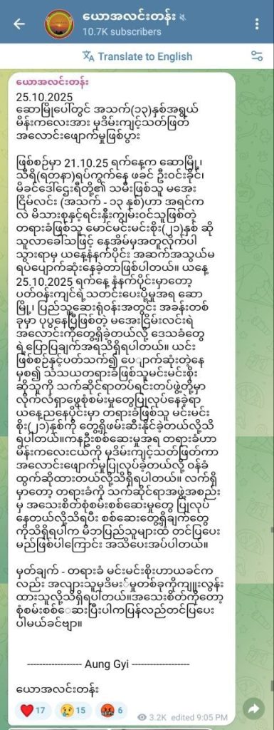 ဖြစ်စဉ်မှာ ယမန်နှစ် အောက်တိုဘာ ၂၁ ရက်နေ့က ဆောမြို့၊ သီရိ(ရတနာ)ရပ်ကွက်နေ ဖခင် ဦး၀င်းခိုင်၊ မိခင်ဒေါ်ဌေးရီတို့၏ သမီးဖြစ်သူ မအေးငြိမ်းလင်း (အသက် – ၁၃ နှစ်)အား ယခင်ကလည်း မိသားစုနှင့်ရင်းနှီးကျွမ်း၀င်သည့် တရားခံဖြစ်သူ ဆော PDF မင်းမင်းစိုး(၂၁)နှစ် က လာခေါ်သဖြင့် နေအိမ်မှအတူလိုက်ပါသွားရာမှ အောက်တိုဘာ ၂၅ ရက်နေ့ နံနက်ပိုင်းအထိ အဆက်အသွယ်မရဘဲ ပျောက်ဆုံးနေခဲ့သည်ဟု ယောအလင်းတန်းက ဖော်ပြခဲ့သည်။