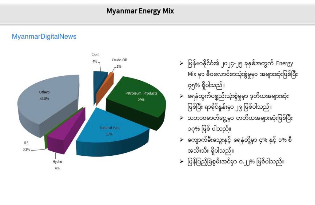 နိုင်ငံတော်၏ စွမ်းအင်သုံးစွဲမှုတွင် ဓာတ်ဆီ၊ ဒီဇယ်ဆီ၊ ရေနံဓာတ်ငွေ့ရည် (LPG) စသည့် ရေနံထွက်ပစ္စည်းများသည် ၂၉ ရာခိုင်နှုန်း ပါဝင်ပြီး သယ်ယူပို့ဆောင်ရေးကဏ္ဍတွင် အဓိကအသုံးပြုလျက်ရှိသည်။