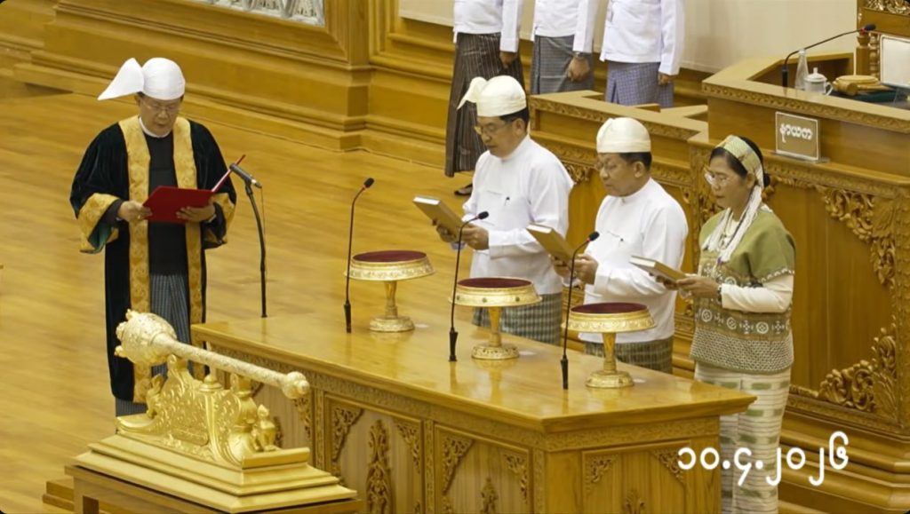 နိုင်ငံတော်သမ္မတအဖြစ် ရွေးချယ်တင်မြှောက်ခံရသူ ဦးမင်းအောင်လှိုင်နှင့် ဒုတိယသမ္မတများအဖြစ် ရွေးချယ်တင်မြှောက်ခံရသော ဦးညိုစောနှင့် ဒေါ်နန်းနီနီအေးတို့က ယနေ့ ကျင်းပသည့် တတိယအကြိမ် ပြည်ထောင်စုလွှတ်တော် ဆဋ္ဌမနေ့ အစည်းအဝေးတွင် ပြည်ထောင်စုလွှတ်တော် နာယက ဦးအောင်လင်းဒွေး၏ ရှေ့မှောက်၌ ကတိသစ္စာပြုကြသည်။