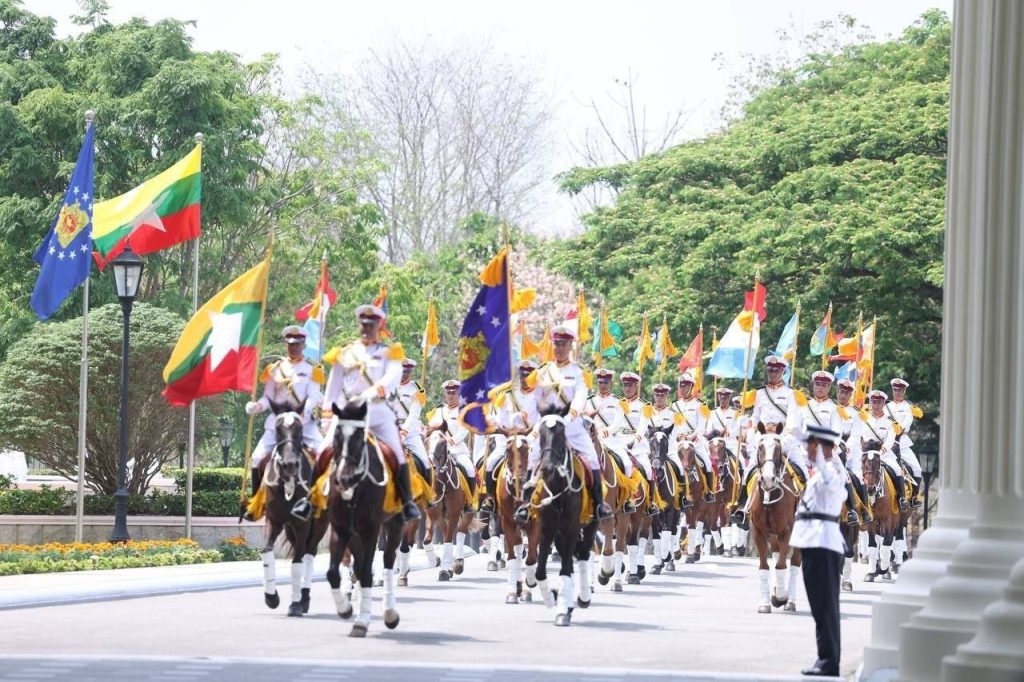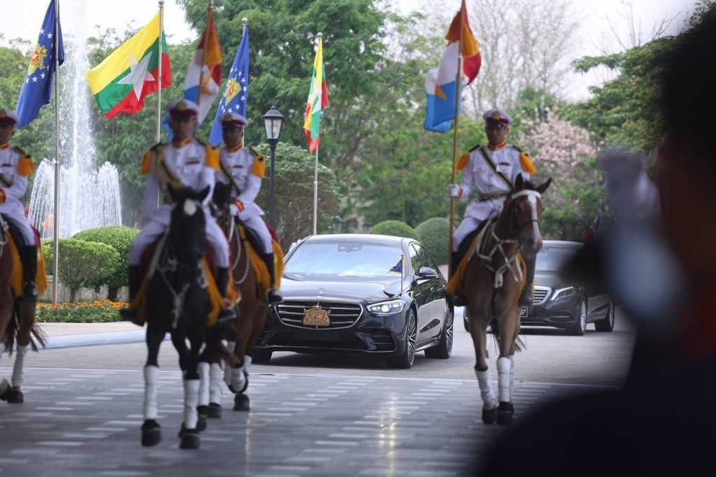 ဦးစွာ နိုင်ငံတော်သမ္မတ ဦးမင်းအောင်လှိုင် လိုက်ပါလာသည့် အထူးယာဉ်တန်းသည် ဂုဏ်ပြုမြင်းစီးတပ်ဖွဲ့၏ ဦးဆောင်ကြိုဆိုမှုဖြင့် နိုင်ငံတော်သမ္မတ၏ ဧည့်ဆောင်တော်ရှိ ဂုဏ်ပြုဆောင်ခန်းမကြီးသို့ ရောက်ရှိလာရာ ဒုတိယသမ္မတ ဦးညိုစော၊ နိုင်ငံတော်သမ္မတရုံး ပြည်ထောင်စုဝန်ကြီး ဦးခင်မောင်ရီတို့က ကြိုဆိုနှုတ်ဆက်ကြသည်။