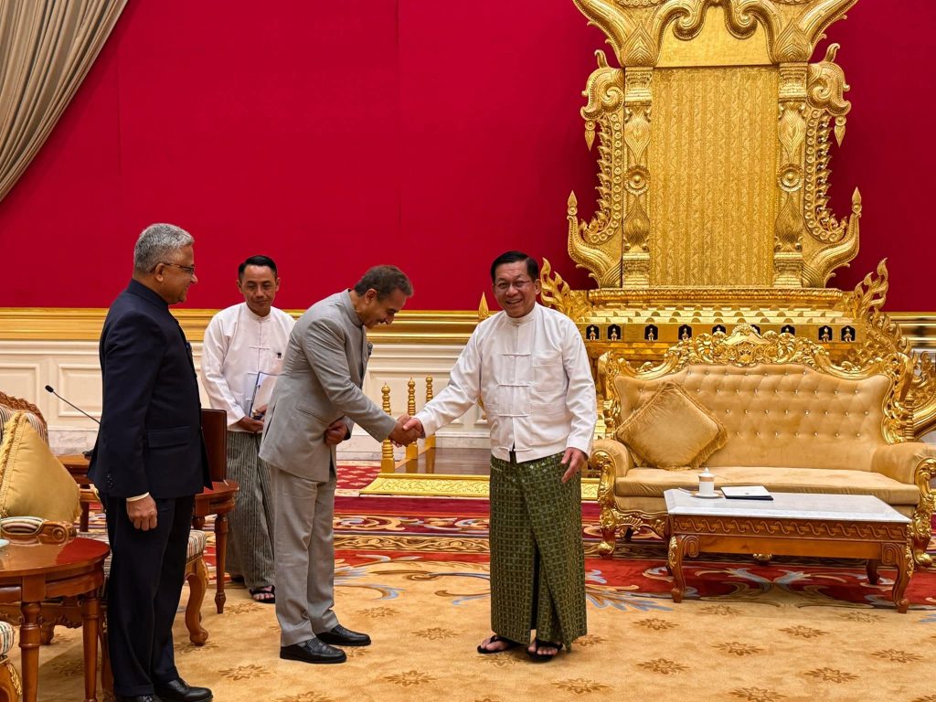 ထိုသို့တွေ့ဆုံစဉ် အိန္ဒိယသမ္မတနိုင်ငံ ဝန်ကြီးချုပ် မစ္စတာနာရန်ဒရာမိုဒီက နိုင်ငံတော်သမ္မတ ဦးမင်းအောင်လှိုင်ထံ ပေးပို့သည့် ဝမ်းမြောက်ကြောင်း သဝဏ်လွှာအား နိုင်ငံတော်သမ္မတထံ အိန္ဒိယနိုင်ငံ ပြည်ပရေးရာဝန်ကြီးဌာန၊ ဒုတိယဝန်ကြီးက လက်ရောက်ပေးအပ်သည်။