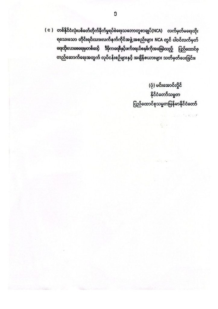 အလားတူ တစ်နိုင်ငံလုံးပစ်ခတ်တိုက်ခိုက်မှုရပ်စဲရေးသဘောတူစာချုပ် (NCA) လက်မှတ်ရေးထိုး ပြီးသည့် တိုင်းရင်းသားလက်နက်ကိုင်အဖွဲ့အစည်းများနှင့် ငြိမ်းချမ်းရေး ပိုမိုခိုင်မာလာ စေရေးမှတစ်ဆင့် ဒီမိုကရေစီနှင့် ဖက်ဒရယ်စနစ်တို့ကို အခြေခံသည့် ပြည်ထောင်စု တည်ဆောက်ရေးအတွက် လုပ်ငန်းစဉ်များနှင့် အချိန်ဇယားများ သတ်မှတ်ပေးခြင်းနှင့် တစ်နိုင်ငံလုံးပစ်ခတ်တိုက်ခိုက်မှုရပ်စဲရေးသဘောတူစာချုပ်(NCA) လက်မှတ်မရေးထိုး ရသေးသော တိုင်းရင်းသားလက်နက်ကိုင်အဖွဲ့အစည်းများ NCA တွင် ပါဝင်လက်မှတ် ရေးထိုးလာစေရေးမှတစ်ဆင့် ဒီမိုကရေစီနှင့်ဖက်ဒရယ်စနစ်ကိုအခြေခံသည့် ပြည်ထောင်စု တည်ဆောက်ရေးအတွက် လုပ်ငန်းစဉ်များနှင့် အချိန်ဇယားများ သတ်မှတ်ပေးခြင်းတို့ကို ဆောင်ရွက်သွားရမည်ဖြစ်ကြောင်း ဖော်ပြထားသည်။