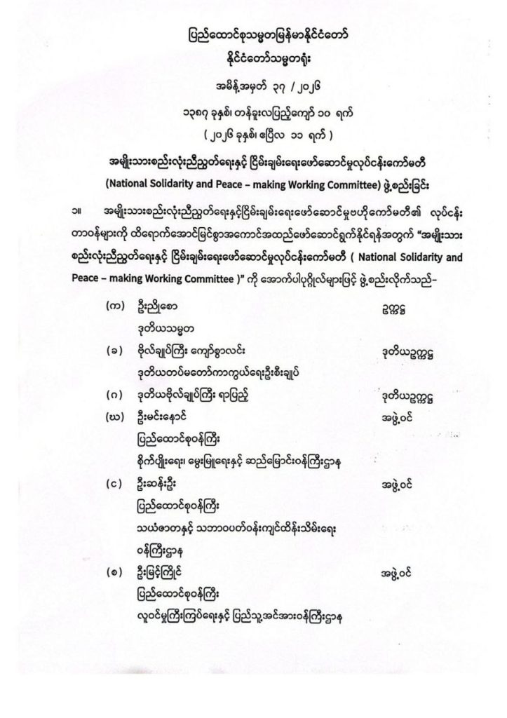 အမျိုးသားစည်းလုံးညီညွတ်ရေးနှင့် ငြိမ်းချမ်းရေးဖော်ဆောင်မှုဗဟိုကော်မတီ (NSPCC) ၏ လုပ်ငန်းတာဝန်များကို ထိရောက်အောင်မြင်စွာ အကောင်အထည်ဖော် ဆောင်ရွက်နိုင်ရန်အတွက် “အမျိုးသားစည်းလုံးညီညွတ်ရေးနှင့် ငြိမ်းချမ်းရေးဖော်ဆောင်မှုလုပ်ငန်းကော်မတီ ( National Solidarity and Peace – making Working Committee (NSPWC) ) ကို ဖွဲ့စည်းလိုက်ကြောင်း နိုင်ငံတော်သမ္မရုံး အမိန့်အမှတ် (၃၇/၂၀၂၆) ဖြင့် ယနေ့တွင် ထုတ်ပြန်ကြေညာခဲ့သည်။