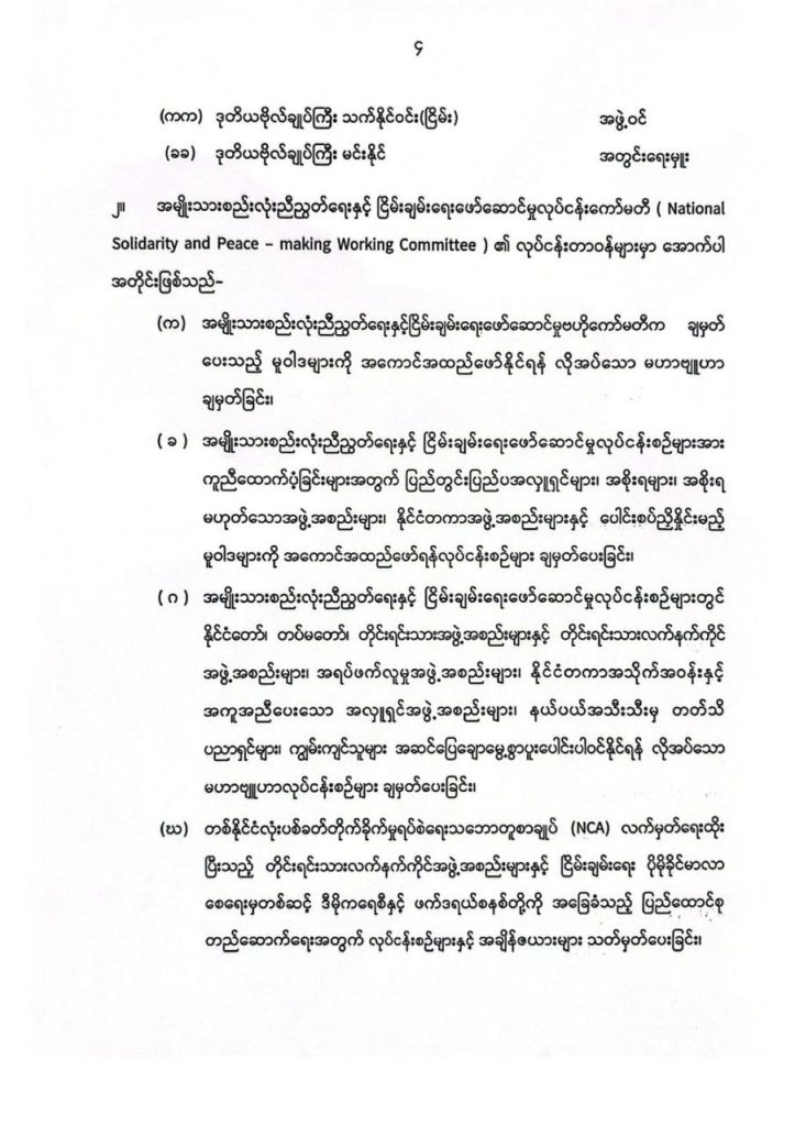 အဆိုပါ အမျိုးသားစည်းလုံးညီညွတ်ရေးနှင့် ငြိမ်းချမ်းရေးဖော်ဆောင်မှုလုပ်ငန်းကော်မတီ (NSPWC) ၏ ဥက္ကဋ္ဌအဖြစ် ဒုတိယသမ္မတ ဦးညိုစော၊ ဒုတိယဥက္ကဋ္ဌအဖြစ် ဒုတိယတပ်မတော်ကာကွယ်ရေးဦးစီးချုပ် ဗိုလ်ချုပ်ကြီးကျော်စွာလင်းနှင့် ဒုတိယဗိုလ်ချုပ်ကြီး ရာပြည့်တို့က တာဝန်ယူဆောင်ရွက်သွားမည်ဖြစ်သည်။