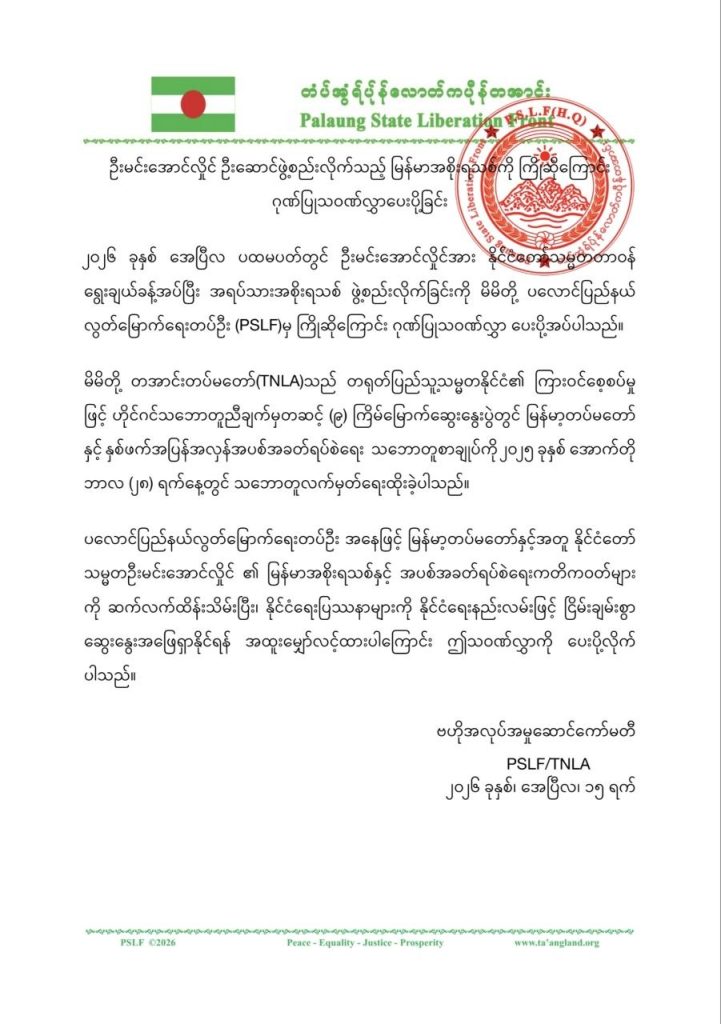 PSLF/TNLA ၏ ခစား သဝဏ်လွှာတွင် “၂၀၂၆ ခုနှစ် အေပြီလ ပထမပတ်တွင် ဦးမင်းအောင်လှိုင်အား နိုင်ငံတော်သမ္မတတာဝန် ရွေးချယ်ခန့်အပ်ပြီး အရပ်သားအစိုးရသစ် ဖွဲ့စည်းလိုက်ခြင်းကို မိမိတို့ ပလောင်ပြည်နယ် လွတ်မြောက်ရေးတပ်ဦး (PSLF)မှ ကြိုဆိုကြောင်း ဂုဏ်ပြုသဝဏ်လွှာ ပေးပို့အပ်ပါသည်။”ဟု ဖော်ပြသည်။