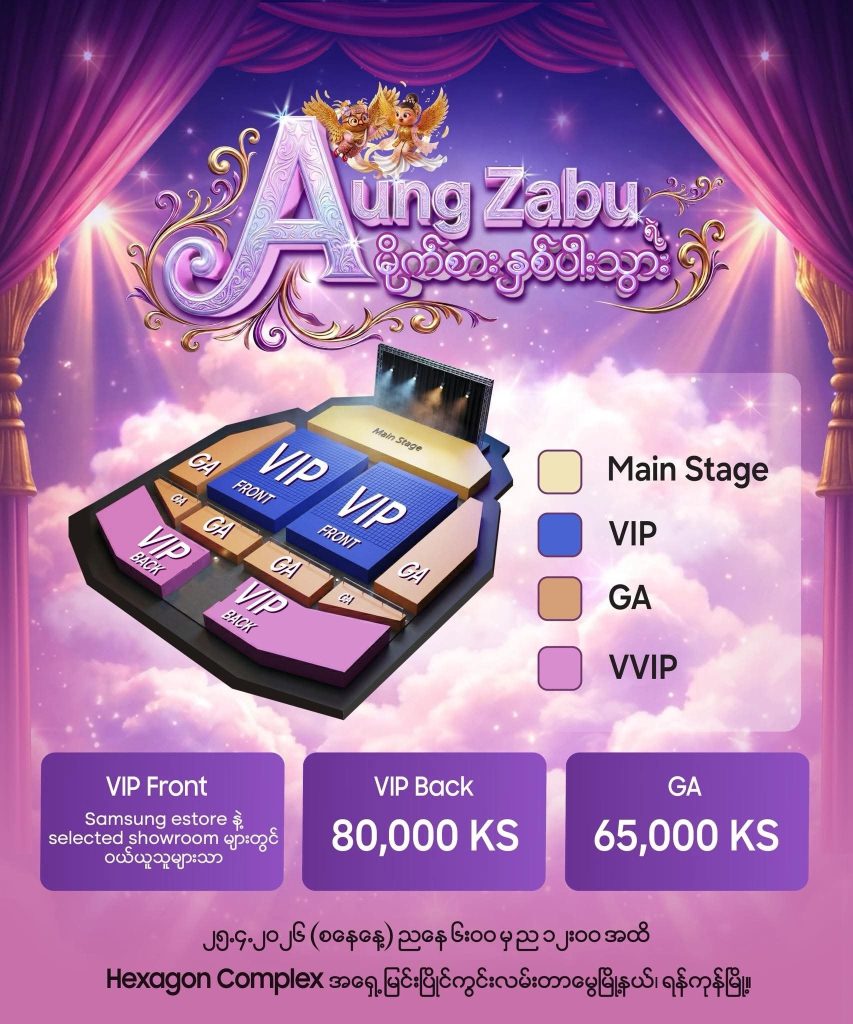 ပွဲလက်မှတ်ဈေးနှုန်းတွေအနေနဲ့ GA ကျပ် ၆ သောင်းခွဲ၊ VIP Back ကျပ် ၈ သောင်း စတဲ့စျေးတွေနဲ့ VIP Front ကို Samsung eStore: bit.ly/3Y4Qf76 နဲ့ Selected showroom တွေဖြစ်တဲ့ Junction Square၊ Junction City၊ Inno City၊ Terminal M၊