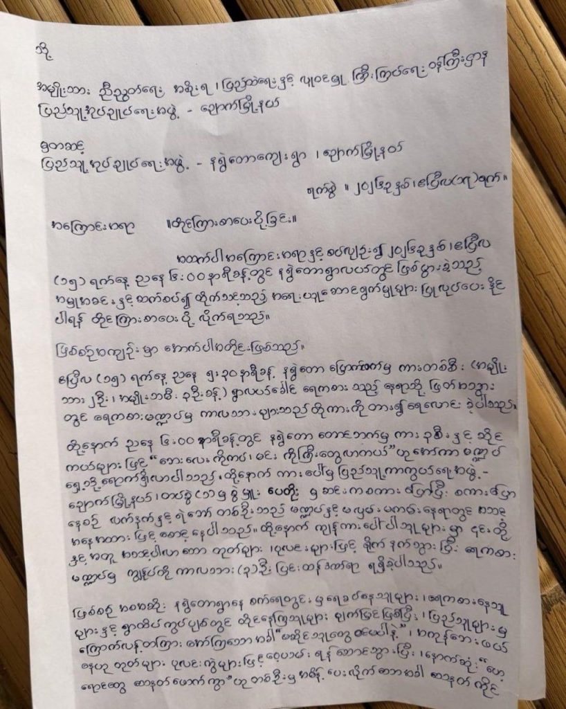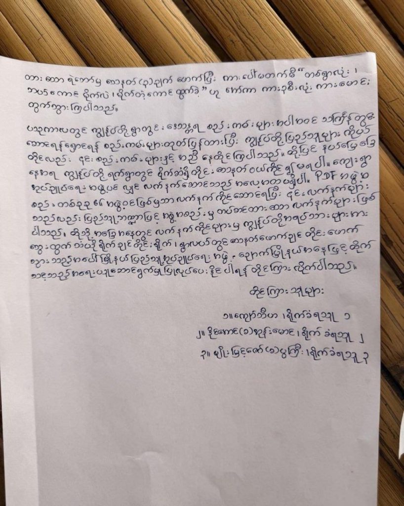 ဒီဖြစ်စဉ်နဲ့ ပတ်သက်ပြီး ကျေးရွာ ဒေသခံတွေက မကျေနပ်တာကြောင့် ဧပြီလ ၁၇ ရက်နေ့ ရက်စွဲနဲ့ NUG ရဲ့ ပြည်ထဲရေးနဲ့ လူဝင်မှုကြီးကြပ်ရေးဌာန၊ ချောက်မြို့နယ် ပအဖကို တိုင်ကြားစာပေးပို့ခဲ့ကြပေမဲ့ အခုအချိန်ထိ ချောက်မြို့နယ် ပအဖ ဘက်က NUG ရဲ့ PDF တွေကို အရေးမယူတဲ့မူအတိုင်း တုံ့ပြန်မှု တစ်စုံတစ်ရာ မရှိသလို စစ်ဆေးအရေးယူမှုလည်း မရှိသေးဘူးလို့ သိရပါတယ်။