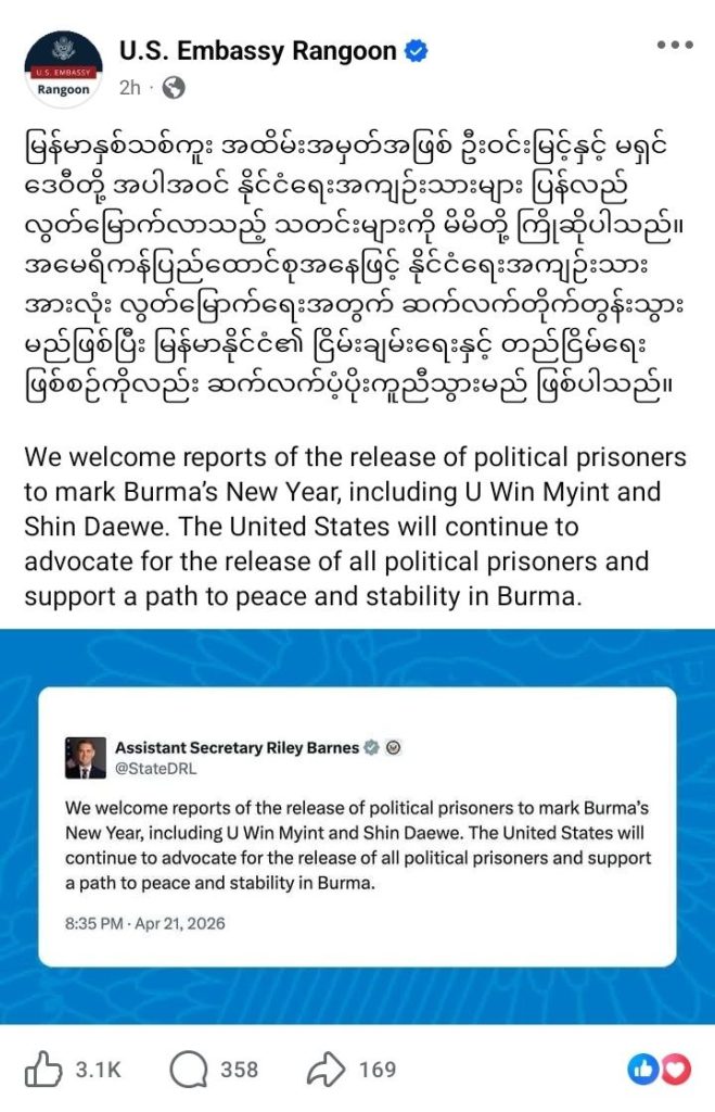 ဦးဝင်းမြင့်အပါအဝင် အကျဉ်းသားများ လွတ်မြောက်လာမှုကို ကြိုဆိုကြောင်းနှင့် နိုင်ငံရေးဆိုင်ရာ အကျဉ်းသားများအားလုံး လွတ်မြောက်ရေးအတွက် ဆက်လက်တိုက်တွန်းသွားမည်ဖြစ်ကြောင်း ရန်ကုန်အခြေစိုက် အမေရိကန်သံရုံးမှ ယနေ့တွင် ထုတ်ပြန်ထားသည်။
