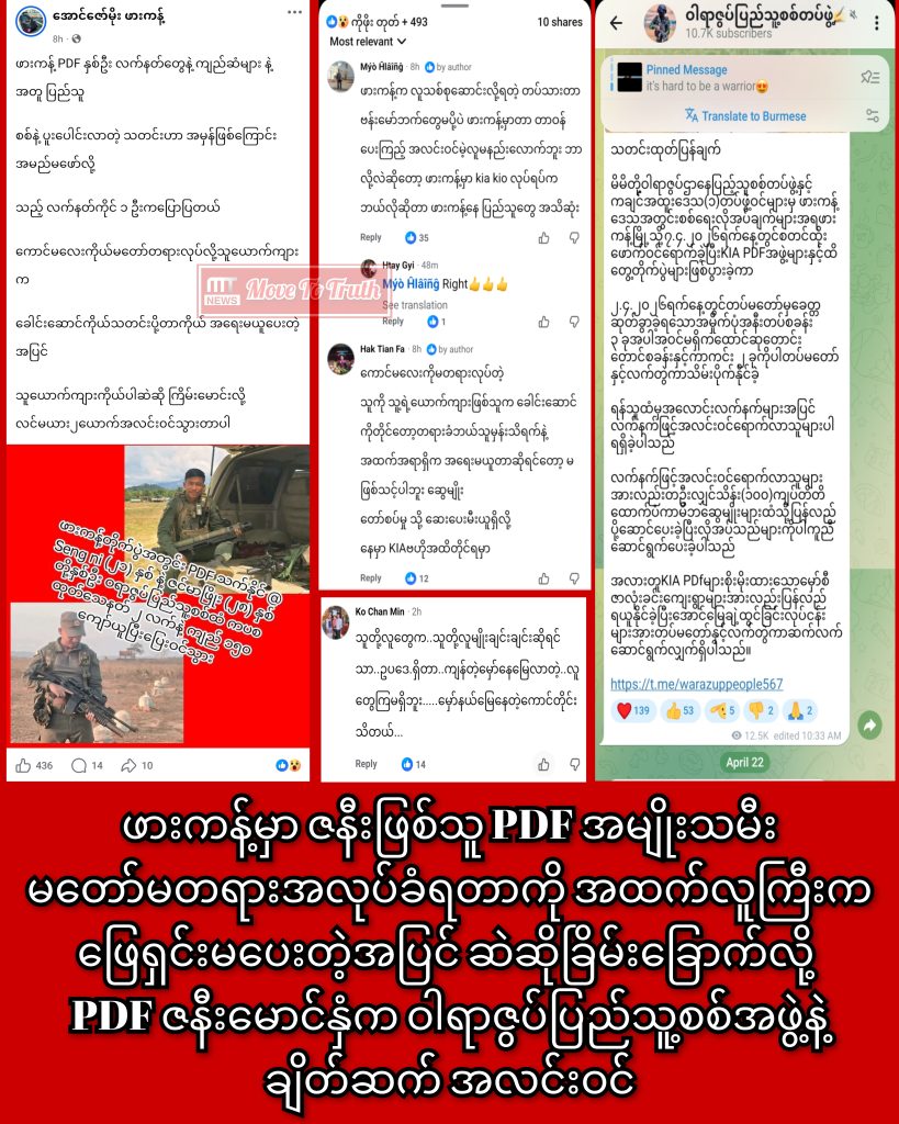 “ဖားကန့် PDF နှစ်ဦး လက်နက်တွေနဲ့ ကျည်ဆံများနဲ့ အတူ ပြည်သူစစ်နဲ့ ပူးပေါင်းလာတဲ့ သတင်းဟာ အမှန်ဖြစ်ကြောင်း အမည်မဖော်လို့သည့် လက်နက်ကိုင် တစ်ဦးက ပြောပြတယ်။ ကောင်မလေးကို မတော်တရားလုပ်လို့ သူယောကျ်ားက ခေါင်းဆောင်ကို သတင်းပို့တာကို အရေးမယူပေးတဲ့ အပြင် သူယောကျ်ားကိုပါဆဲဆို ကြိမ်းမောင်းလို့ လင်မယားနှစ်ယောက်အလင်း၀င်သွားတာပါ”လို့ ဖားကန့်သတင်းတွေကို ဖော်ပြပေးနေတဲ့ အောင်ဇော်မိုး (ဖားကန့်) ကလည်း လူမှုကွန်ရက်မှာ ရေးသား ဖော်ပြထားပါတယ်။