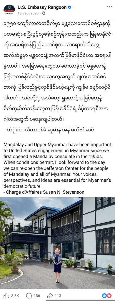 လုံခြုံရေးနှင့် နိုင်ငံရေးအခြေအနေများကြောင့် ငါးနှစ်ခန့်ကြာအောင် ပိတ်ထားသည့် အမေရိကန်သံရုံး၏ မန္တလေးမြို့ရှိ ဂျက်ဖာဆင်စင်တာကို တရားဝင် ပြန်လည်ဖွင့်လှစ်လိုက်ပြီဖြစ်ကြောင်း မြန်မာနိုင်ငံဆိုင်ရာ အမေရိကန်သံရုံးက ယနေ့ အတည်ပြုထုတ်ပြန်သည်။