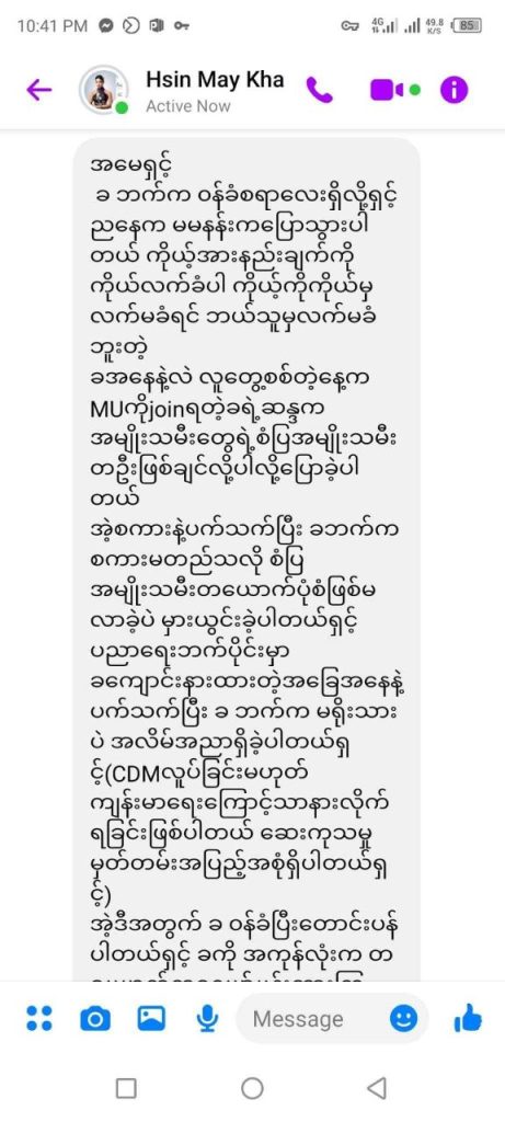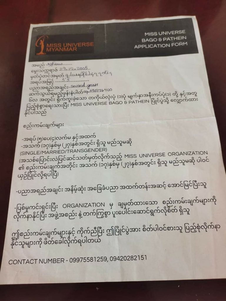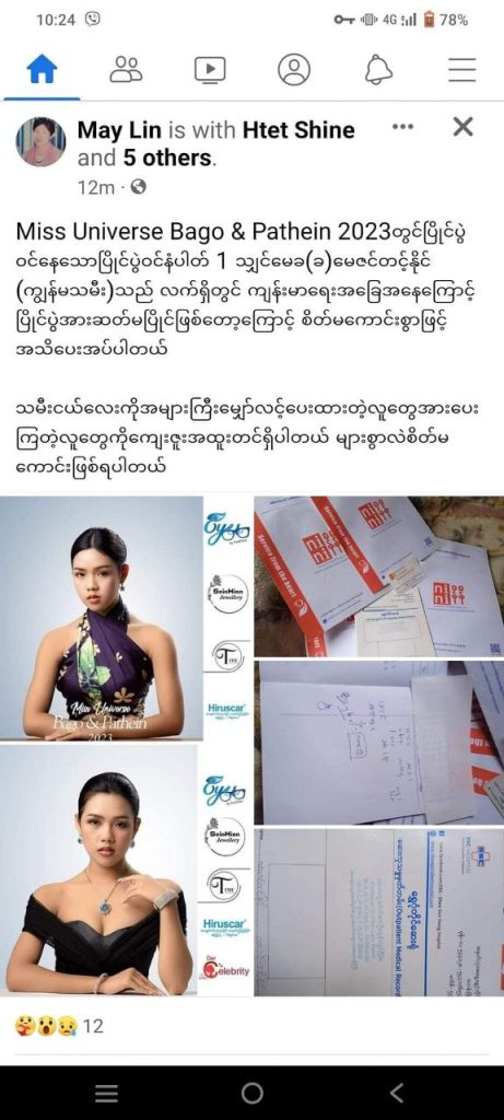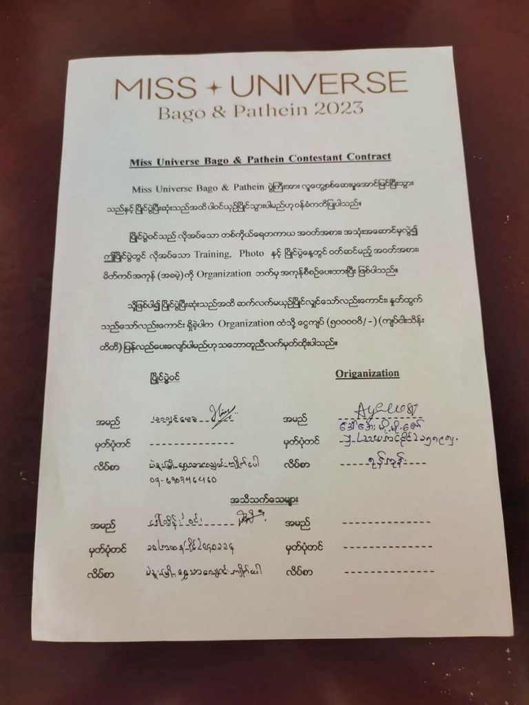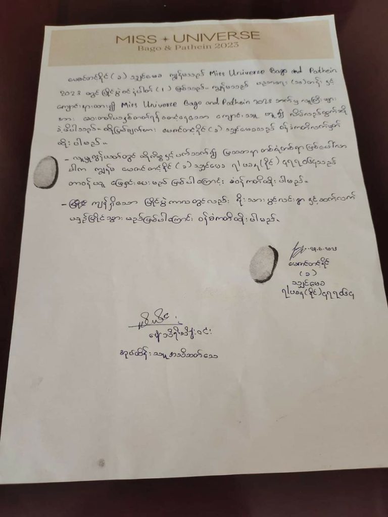 “ဒီပြိုင်ပွဲ စတင်ပြိုင်တည်းက ပြိုင်ပွဲဝင် မိန်းကလေး ၁၇ ယောက်လုံးကို ဒီပြိုင်ပွဲပြီးဆုံးသည်အထိ ဘာအကြောင်းကြောင့်ဖြစ်စေ ဆက်လက်ယှဉ်ပြိုင်ပါမယ်။ တကယ်လို့ နှုတ်ထွက်ခဲ့ရင် လျော်ကြေးငွေ ၅သိန်းပေးလျော်ပါမယ်လို့ မိဘအုပ်ထိန်းသူရှေ့မှောက်မှာ လက်မှတ်ရေးထိုးစေခဲ့ပါတယ်။ သျှင်မေခ (ခ) မေဇင်တင့်နိုင်က သူ့ဘက်က စတင်ပြီး ကျန်းမာရေးအကြောင်းကြောင့် ဆက်လက်မယှဉ်ပြိုင်နိုင်ပါဘူးလို့ စတင် Post တင်ခဲ့တယ်။ လျော်ကြေးငွေ တောင်းခံတဲ့ အခါမှာလည်း ပေးလျော်ခြင်းမရှိ Organization ဘက်ကိုလည်း တောင်းပန်ခြင်းမရှိဘဲ နှုတ်ထွက်သွားတဲ့အတွက် ကျွန်မတို့ Organization ဘက်ကလည်း ပညာရေး Background နောက်ခံ အကြီးမားဆုံး လိမ်လည်တဲ့အတွက် Organization မှ ထုတ်ပယ်လိုက်ပြီ။ Organization ဘက်မှ တရားဥပဒေအတိုင်း စည်းကမ်းချက် လုပ်ထုံးလုပ်နည်းတွေနဲ့ အညီ ထိရောက်စွာ ဆက်လက် ဆောင်ရွက်သွားမှာဖြစ်ပါတယ်”လို့ Miss Universe Bago & Pathein က တရားဝင်အသိပေးလာတာဖြစ်ပါတယ်။