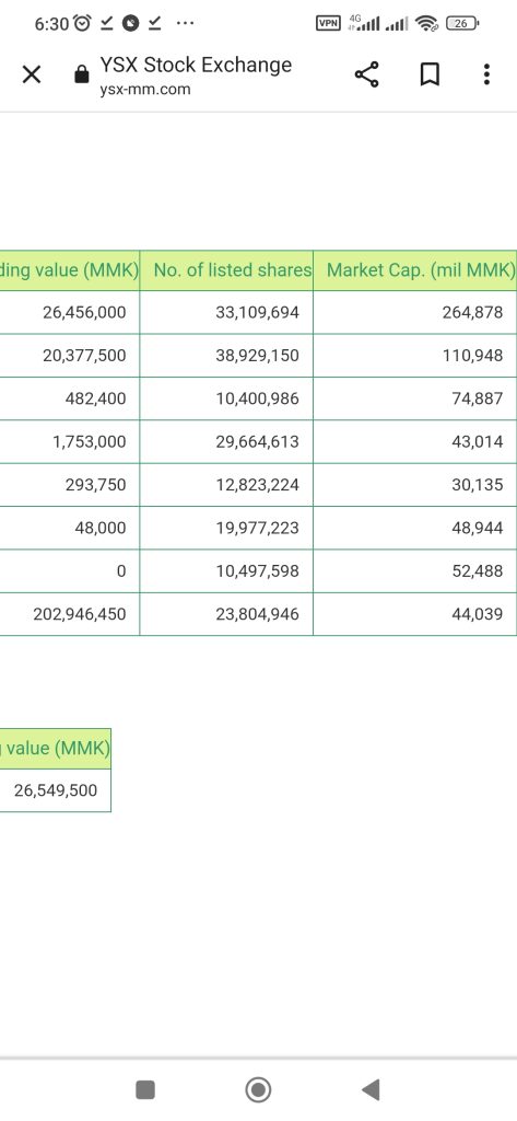 ထို့နောက် စတင်အရောင်းဖွင့်လှစ်သည့် စျေးကွက်အခြေခံအဖွင့်စျေးဖြင့် အရောင်းအဝယ်ပြုလုပ်ရာ အနိမ့်ဆုံးစျေးနှုန်း ကျပ် ၁၇၅၀ နှင့် အမြင့်ဆုံးစျေးနှုန်း ၁၈၅၀ ကျပ်အကြား အစုရှယ်ယာ ၁၁၂၄၇၃ စု အရောင်းအဝယ်ဖြစ်ခဲ့ပြီး တစ်နေ့တာအတွင်း ကျပ် ၂၀၂၉၄၆၄၅၀ ဖိုး အရောင်းအဝယ်ဖြစ်ခဲ့သည်။